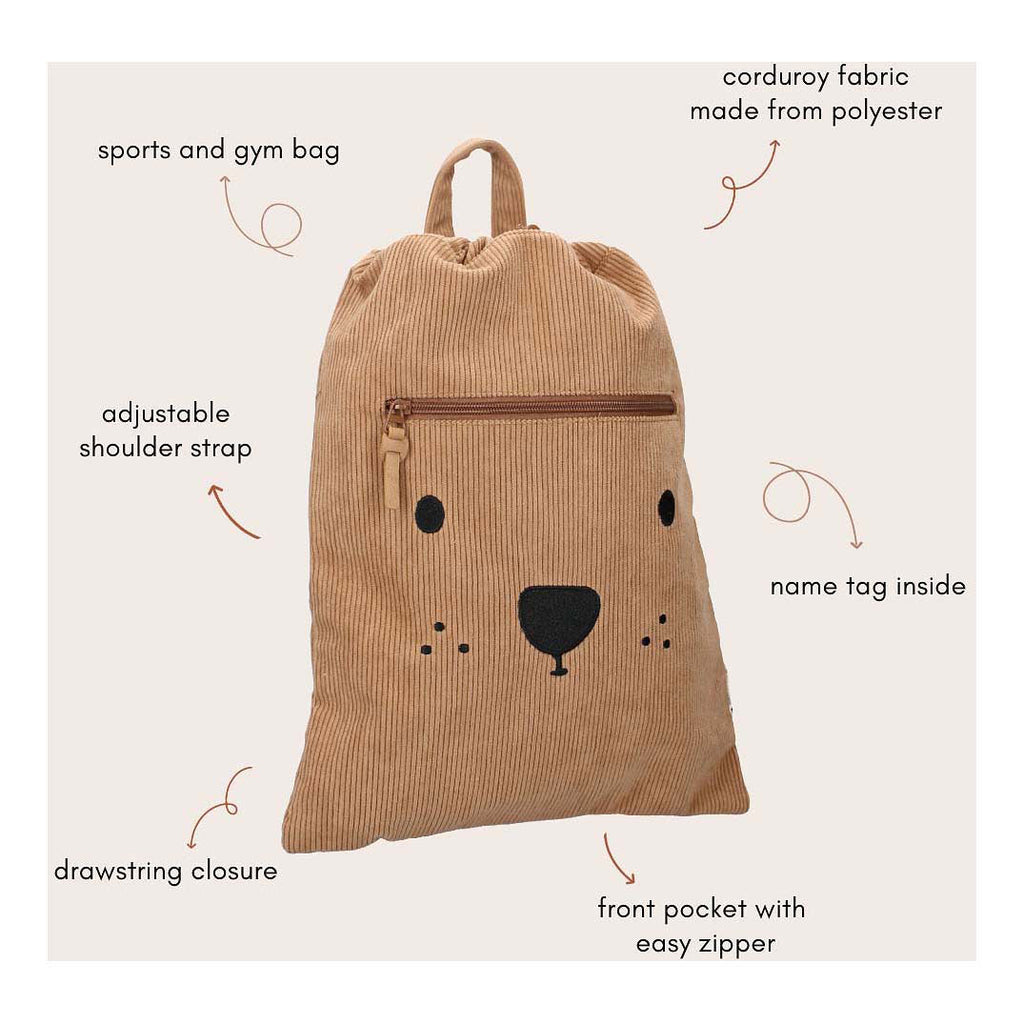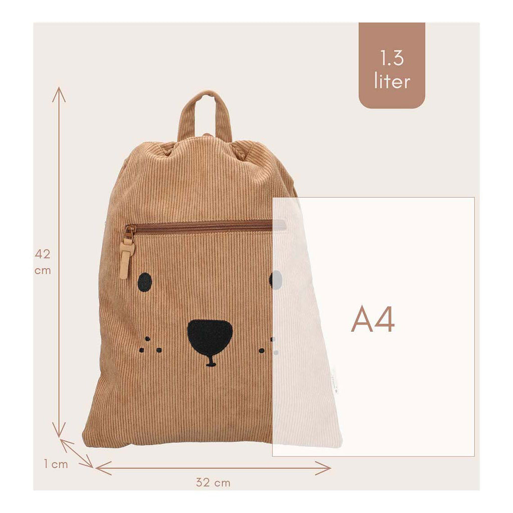 Betreedt de wereld van stijl met onze Kidzroom gymtas uit de "Teddy in Town" collectie! Deze gymtas is gemaakt van corduroy en heeft een zachte beige kleur. Op de voorkant zit een teddybeer gezicht! De tas is ontworpen met het oog op gemak en stijl, met sluit touwtjes die het afsluiten moeiteloos maken. Met de beige kleur en praktische ontwerp is deze gymtas de perfecte metgezel voor elke gelegenheid. Voeg een vleugje stijl toe aan het dagelijkse routine met de gymtas van Kidzroom uit de "Teddy in Town" collectie!