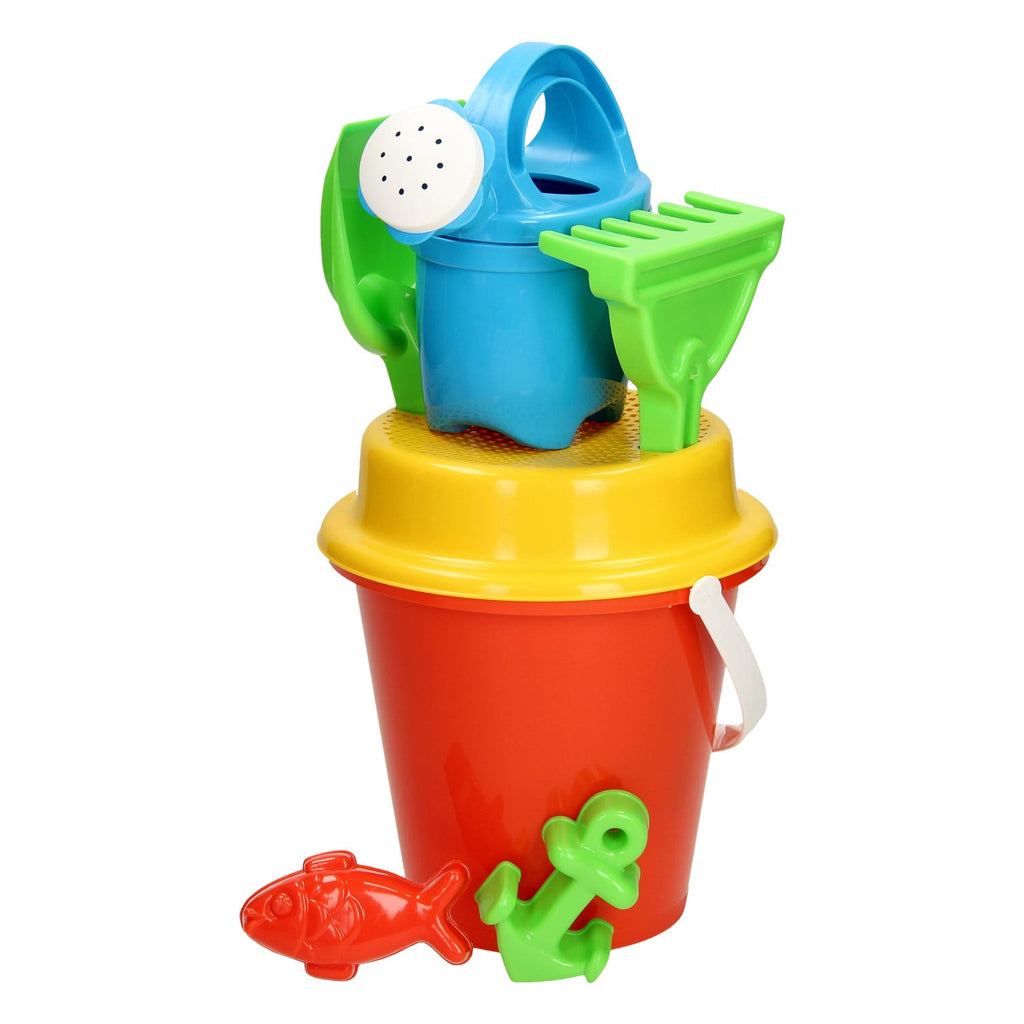 Een vrolijke elektrische emmerset met gieter, zeef, schepje, hark, 2 zandvormen en een emmer.