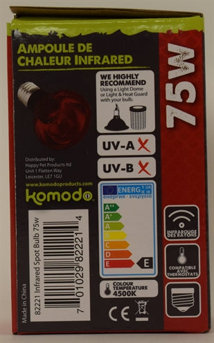 De beste keuze voor constante warmte. De Komodo Infrarood warmtelamp biedt een constante IRA warmtestraling voor reptielen, dag en nacht. De lamp kan met een thermostaat worden bestuurd voor veiliger gebruik.