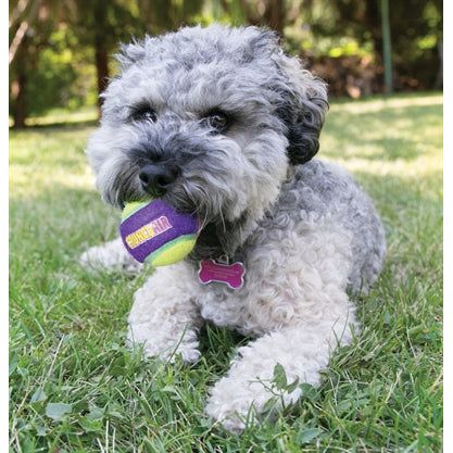 De meeste honden zijn gek op tennisballen, maar helaas zijn normale tennisballen niet ideaal voor het gebit. De harde vezels van 'echte' tennisballen schuren langs de tanden en kunnen daar blijvende schade aanbrengen. Daarom heeft KONG een speciaal materiaal ontwikkeld voor haar tennisballen, wat veel zachter is voor het gebit. Om het nog leuker te maken zijn deze ballen uitgerust met een binnenkant die kraakt wanneer er op de tennisbal wordt gebeten, om aan de natuurlijke winstincten van de hond te voldoen. De bal stuitert hoog voor meer speel- en apporteerplezier.