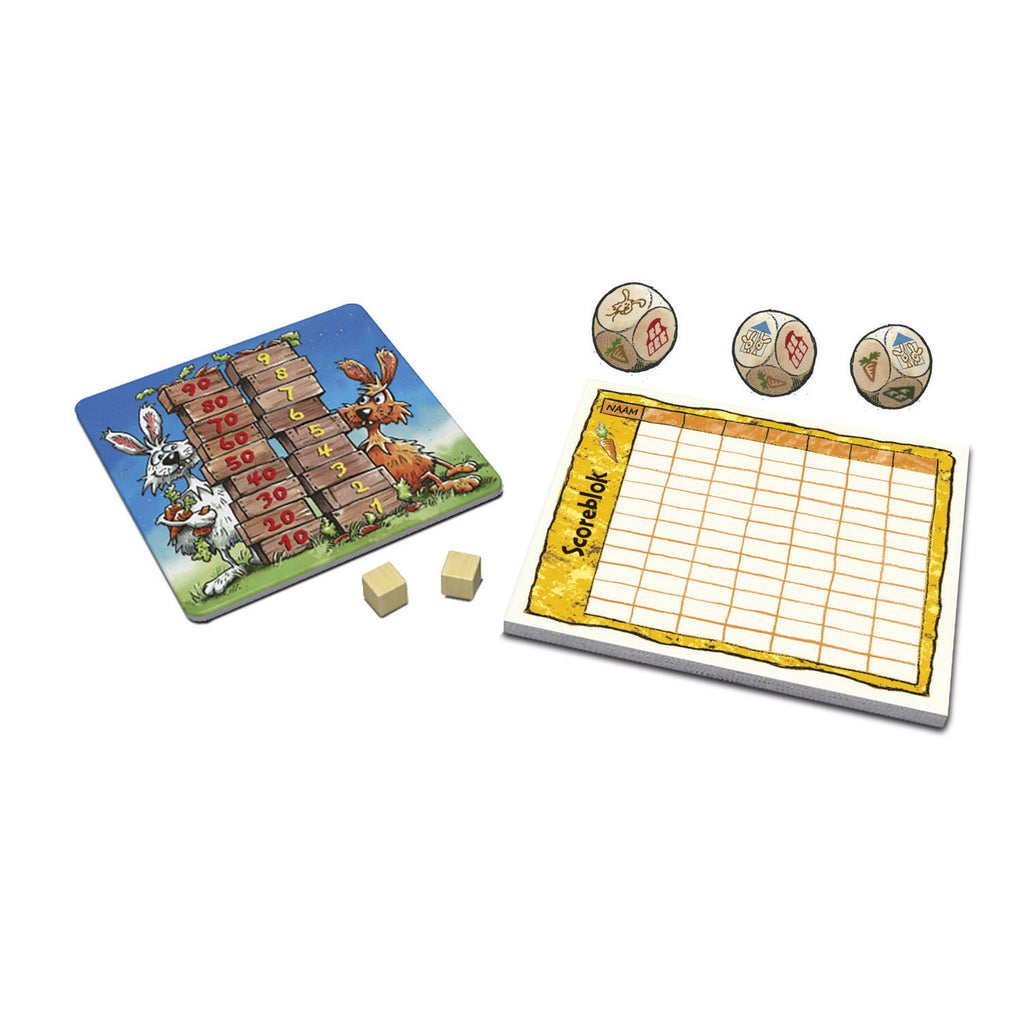 Vlot, zenuwslopend dobbelspel waarbij spelers konijnen en hokken dobbelen om punten te scoren. Het doel is om de juiste symbolen te gooien en door te gaan, maar spelers kunnen ervoor kiezen om te stoppen en punten te schrijven. Tijdens je beurt gooi je met de dobbelstenen en leg je minimaal één konijn opzij. Hokken kunnen ook opzij worden gelegd, maar in oplopende volgorde. Wortels moeten ook worden weggelegd, maar mogen niet opnieuw worden geplaatst. Gooi daarna je de niet-opzij-gelegde dobbelstenen opnieuw. Dit gaat door totdat je niet meer verder kunt of wilt. Als je na een worp geen konijnen kunt leggen, scoor je geen punten. Als je besluit te stoppen, scoor je het aantal konijnen vermenigvuldigd met het niveau van je hokken. De volgende speler kan ervoor kiezen om het risico te nemen en door te spelen met het aantal punten dat jij hebt geschreven. Konijnen Hokken is een spannend dobbelspel voor maximaal 7 spelers en ideaal voor op vakantie.