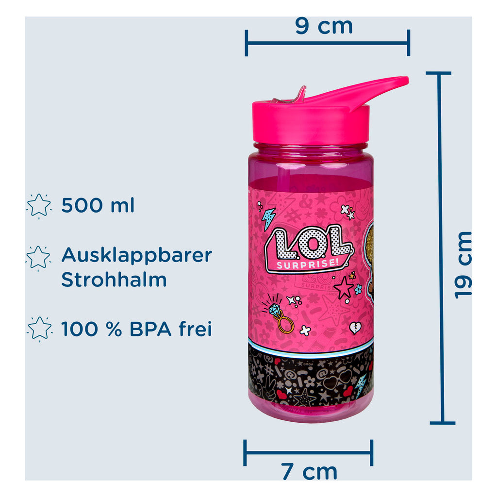 De Roze LOL Verrassing! drinkfles is perfect voor alle fans van LOL Surprise! Het heeft een leuke afbeelding van je favoriete LOL Surprise! karakters. Deze drinkfles heeft een handig af te sluiten rietje, waardoor morsen wordt voorkomen. Met een inhoud van 500 milliliter is er voldoende ruimte voor al je favoriete oplossing. De drinkfles is 19 cm hoog en heeft een diameter van 9 cm, waardoor hij perfect is voor kinderen vanaf 3 jaar oud.