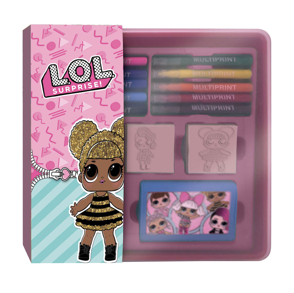 Stempelset van LOL Surprise in stevige, kunststof opbergbox. De stempelset bevat 4 grote, houten stempels van LOL Surprise, een stempelkussen met afwasbare inkt, 10 stiften, 10 stickers en een kleurboekje. Geschikt voor kinderen vanaf 3 jaar oud.