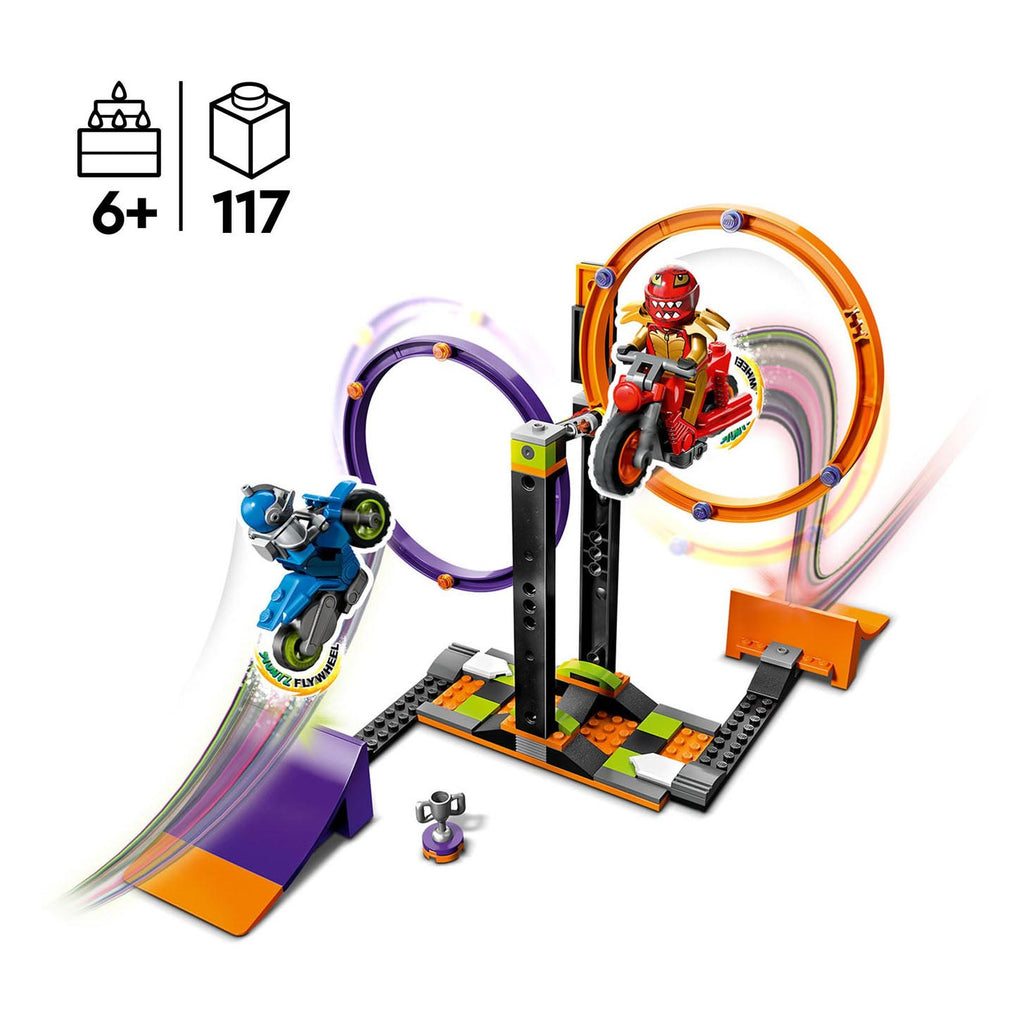 Kinderen kunnen spannende stuntshows, spelletjes en wedstrijden voor 1 of 2 spelers organiseren met deze LEGO City Stuntz Spinning Stunt-uitdaging (60360) speelset met een draaibare dubbele springring, 2 schansen en 2 stuntmotoren met vliegwielaandrijving. Voeg de 2 LEGO City Stuntz minifiguren van motorrijders toe en laat de pret beginnen. Jongens en meisjes stellen hun vaardigheden op proef, voeren geweldige shows uit of nemen het op tegen vrienden en familie met deze speelgoedset voor kinderen vanaf 6 jaar. Na een simpel vliegduwtje rijdt de stuntmotor metwielaandrijving automatisch met hoge snelheid de helling op om vervolgens de perfecte sprong te maken door de ringen. Kinderen kunnen de ringen draaien voor een nog grotere uitdaging en meer plezier. Leuk cadeau voor kinderen die van voertuigen houden, stuntshows en bouwen, ontdek ook de andere LEGO City speelsets en laat je soort nog meer leuke personages, kenmerken en gebouwen ontdekken voor eindeloze fantasierijke rollenspellen. Afmetingen: de Spinning Stunt-uitdaging is met de ringen vastgeklikt ca. 20 cm hoog, 26 cm breed en 39 cm diep. Bevat 117 onderdelen.