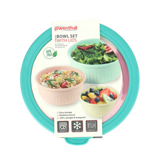 Lowenthal Kommenset 4 stuks. Set van 4 kleurrijke kommen van stevige kunststof. Perfect te gebruiken als mengkommen of bewaarbakken. Geschikt voor de vaatwasser, vriezer en magnetron. Inclusief deksels. Inhoud: 400 ml, 730 ml, 1250 ml, 2200 ml.