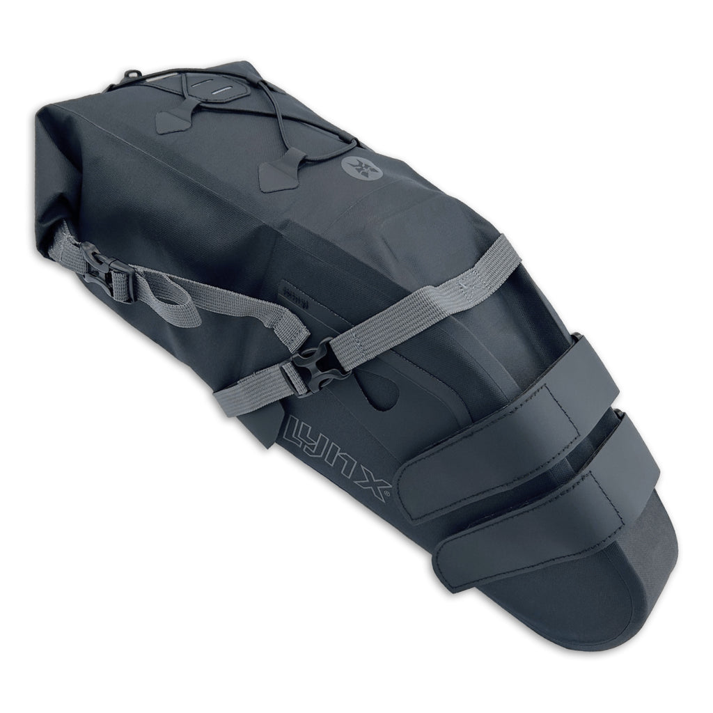 Deze extra ruime zadeltas van Lynx is ideaal voor meerdaagse bikepackingtochten met een mountainbike, grindfiets of racefiets. Dankzij het royale volume is er voldoende ruimte voor kleding, gereedschap en andere uitrusting. Bovenop de tas bevindt zich een elastisch trekkoord voor extra opbergruimte, perfect om een bodywarmer of jas snel bij de hand te houden. De tas is gemaakt van waterdicht en duurzaam materiaal en voorzien van verstevigingen aan de zij-, boven- en onderzijde. Een geïntegreerd ventiel maakt het mogelijk om overtollige lucht eenvoudigweg te laten ontsnappen. Compressiebanden zorgen ervoor dat de inhoud stevig en compact blijft. De bevestiging aan de fiets verloopt via klittenband aan de zadelpen en gespen onder de zadelrails, wat zorgt voor stabiliteit op elk terrein. Deze tas maakt deel uit van de Wildtrack-serie en is perfect te combineren met andere bikepacking-tassen uit dezelfde lijn.