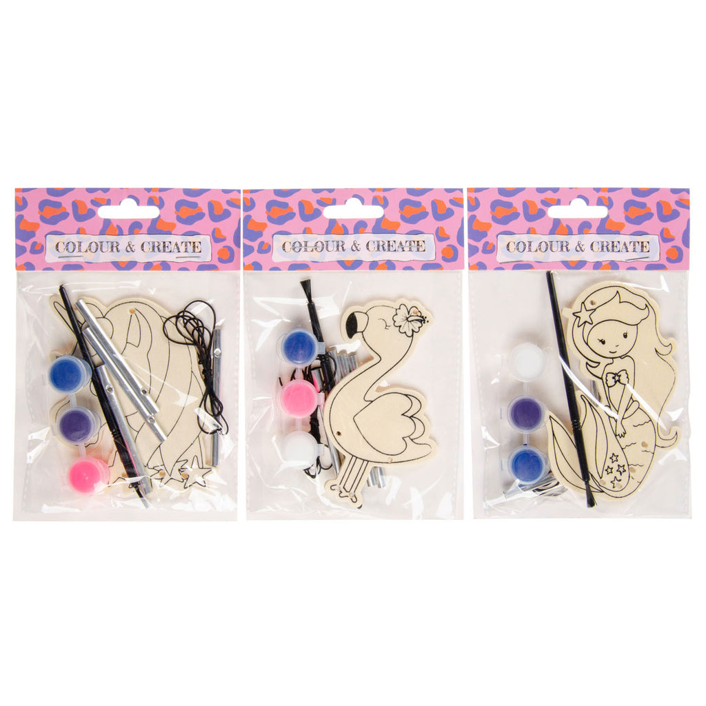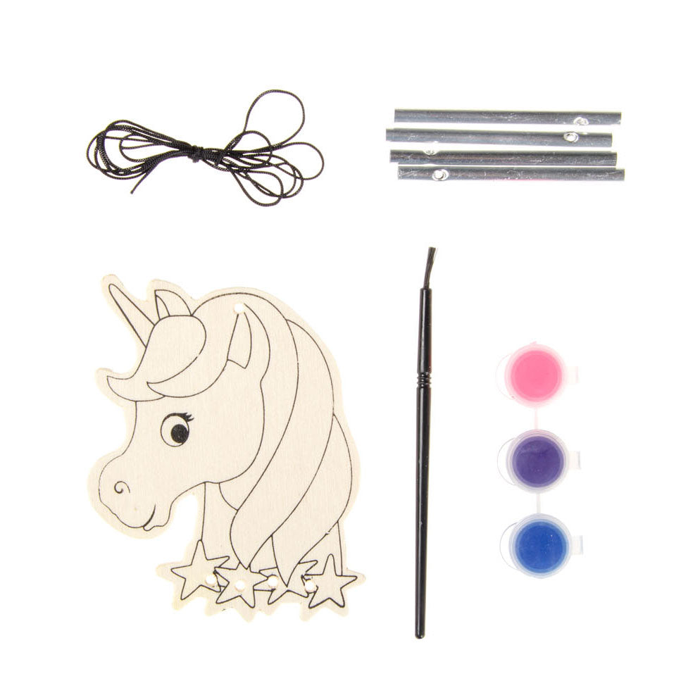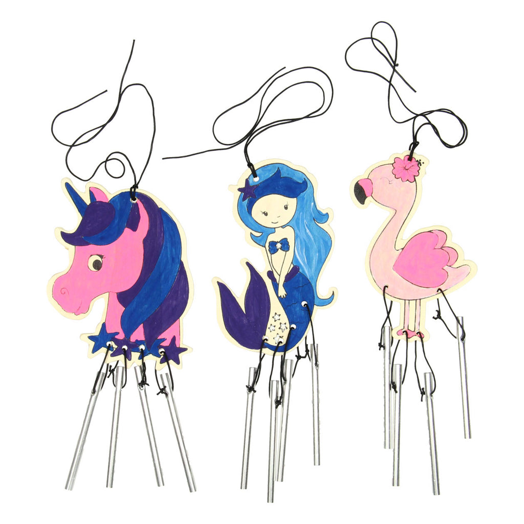 Maak je eigen windklokkenspel set met touw, metalen buisjes, houten figuur en verf. Verschillende versies worden origineel door elkaar geleverd: eenhoorn, flamingo en zeemeermin.