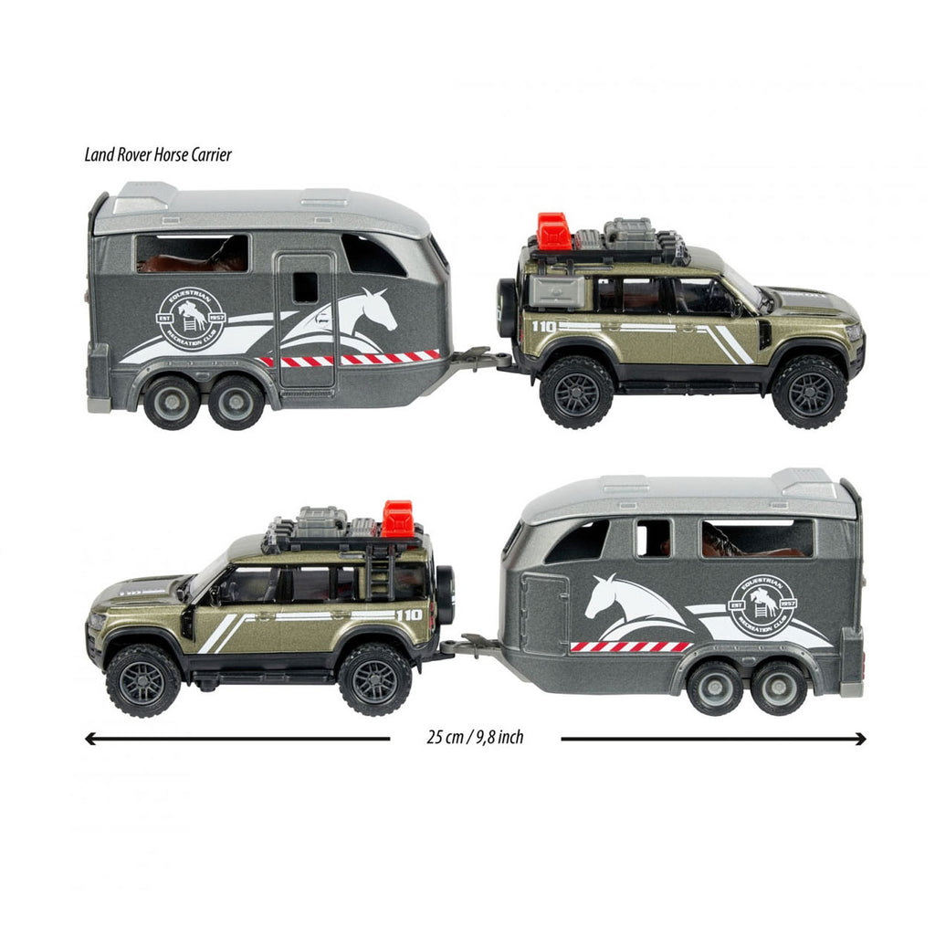 Speelgoedauto met paardentrailer van Majorette. Deze Land Rover heeft openslaande achterdeuren, rubberen banden en realistische licht- en geluidseffecten.