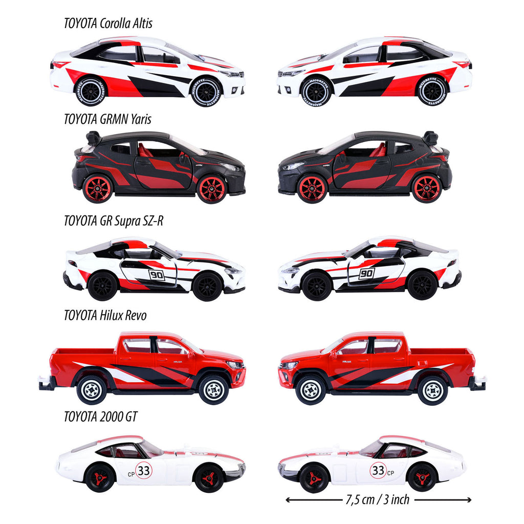Verover het racecircuit met deze officiële licentieerde Majorette Toyota-racewagens: deze vijf opvallende voertuigen worden onmogelijk het onmogelijke van je modelvoertuigcollectie! Deze unieke selectie speelgoedauto's toont het gevarieerde aanbod van Toyota-voertuigmodellen, van sportcoupé tot limousine. De speelgoedautoset bevat 5 verschillende Toyota-modellen: 1. Toyota 2000 GT (wit) 2. Toyota Hilux Revo (rood) 3. Toyota GR Supra SZ-R (wit) 4. Toyota Corolla Altis (wit) 5. Toyota GRMN Yaris (zwart). Kenmerken • Toyota Auto Edition - 5 Toyota raceauto's in één set - een must-have voor verzamelaars en racefans! Elke auto heeft een officiële licentie en vertegenwoordigt een andere Toyota-serie. • 5-delige cadeauset - De Majorette speelgoedautoset bevat 5 verschillende Toyota-modellen: 1. Toyota 2000 GT, 2. Toyota Hilux Revo, 3. Toyota GR Supra SZ-R, 4. Toyota Corolla Altis, 5. Toyota GRMN Yaris. • Voor kinderen van 3 jaar en ouder - Miniatuurraceauto's voor jonge fans van modelvoertuigen: Deze stevige ingebouwde auto's zijn voorzien van roterende wielen, ophanging en onderdelen die open kunnen en zijn geweldige speelgoed en verzamelobjecten. • Majorette - Als een van de meest innovatieve producenten van modelvoertuigen combineren wij traditie met innovatie. Wij zijn opgericht in 1964 en gespecialiseerd in premium ontwerpen en hoogwaardige materialen.