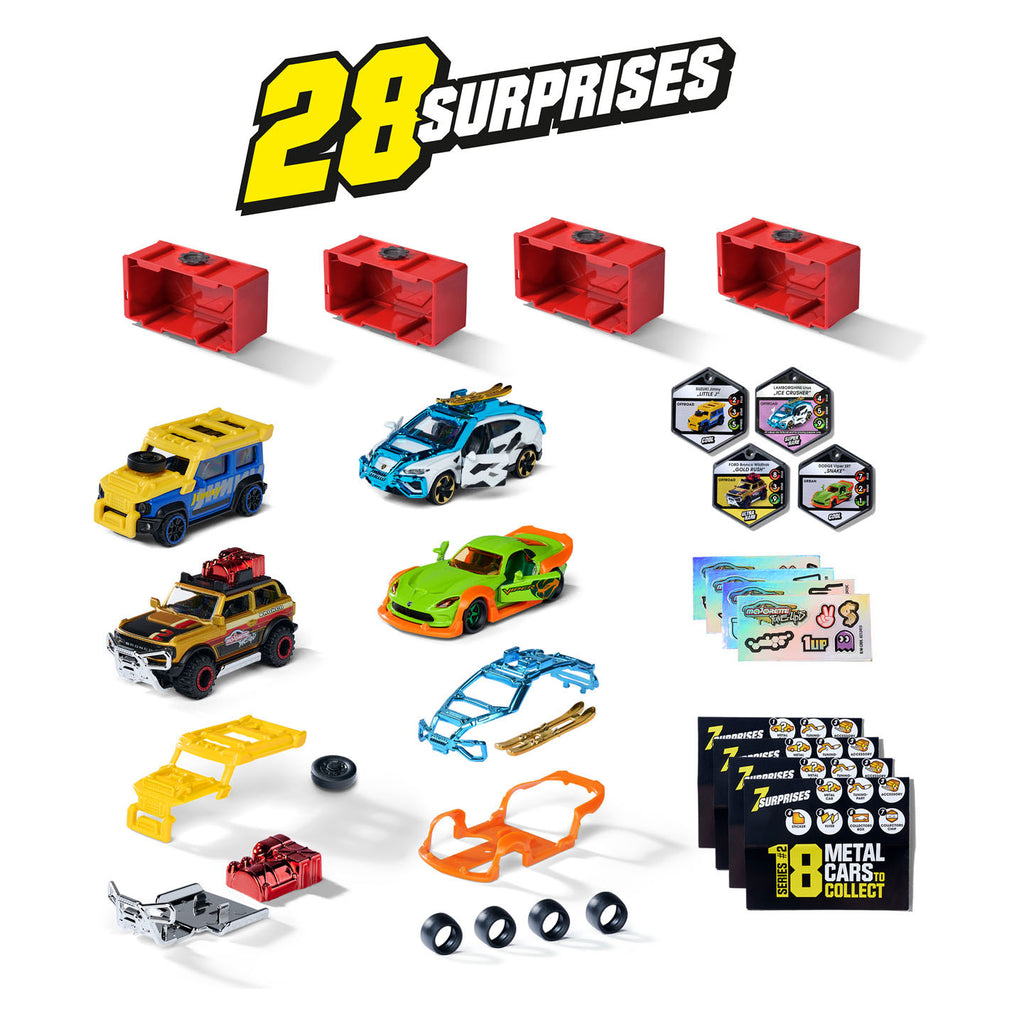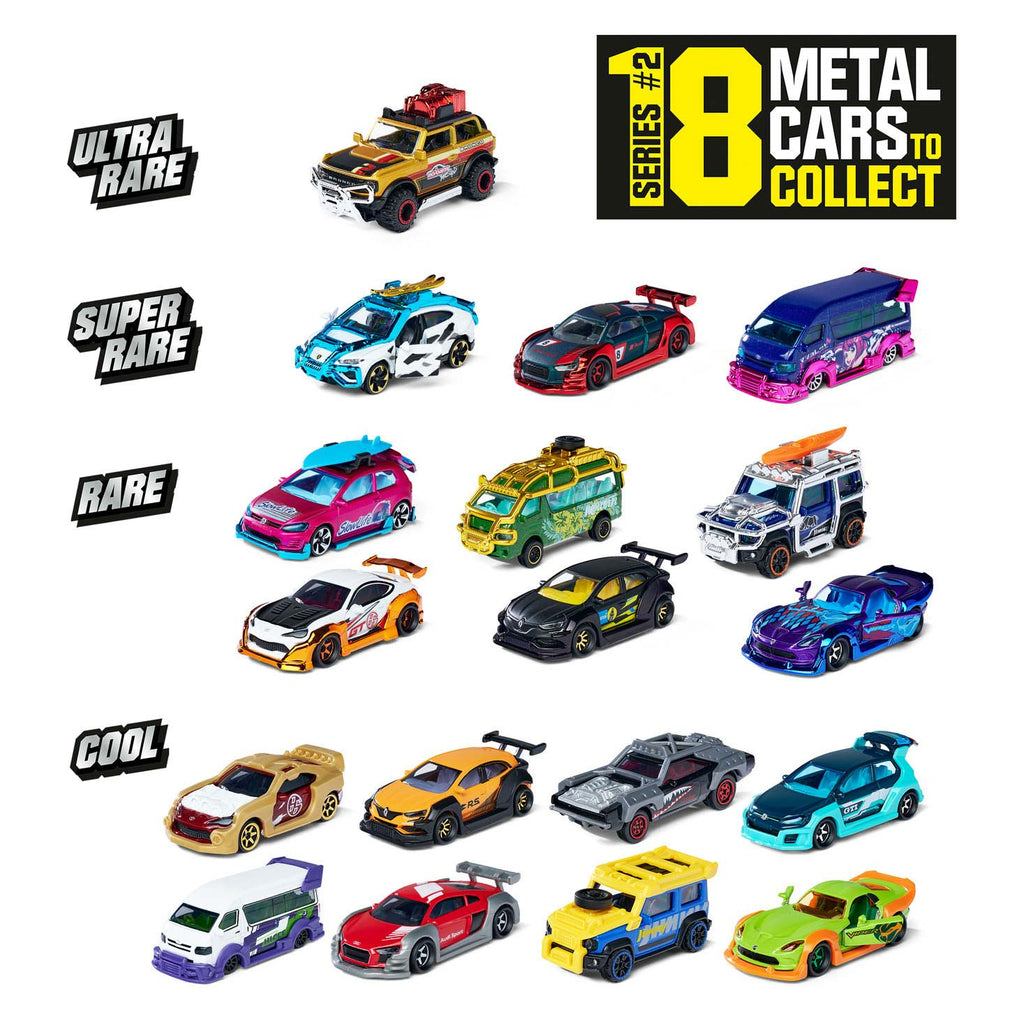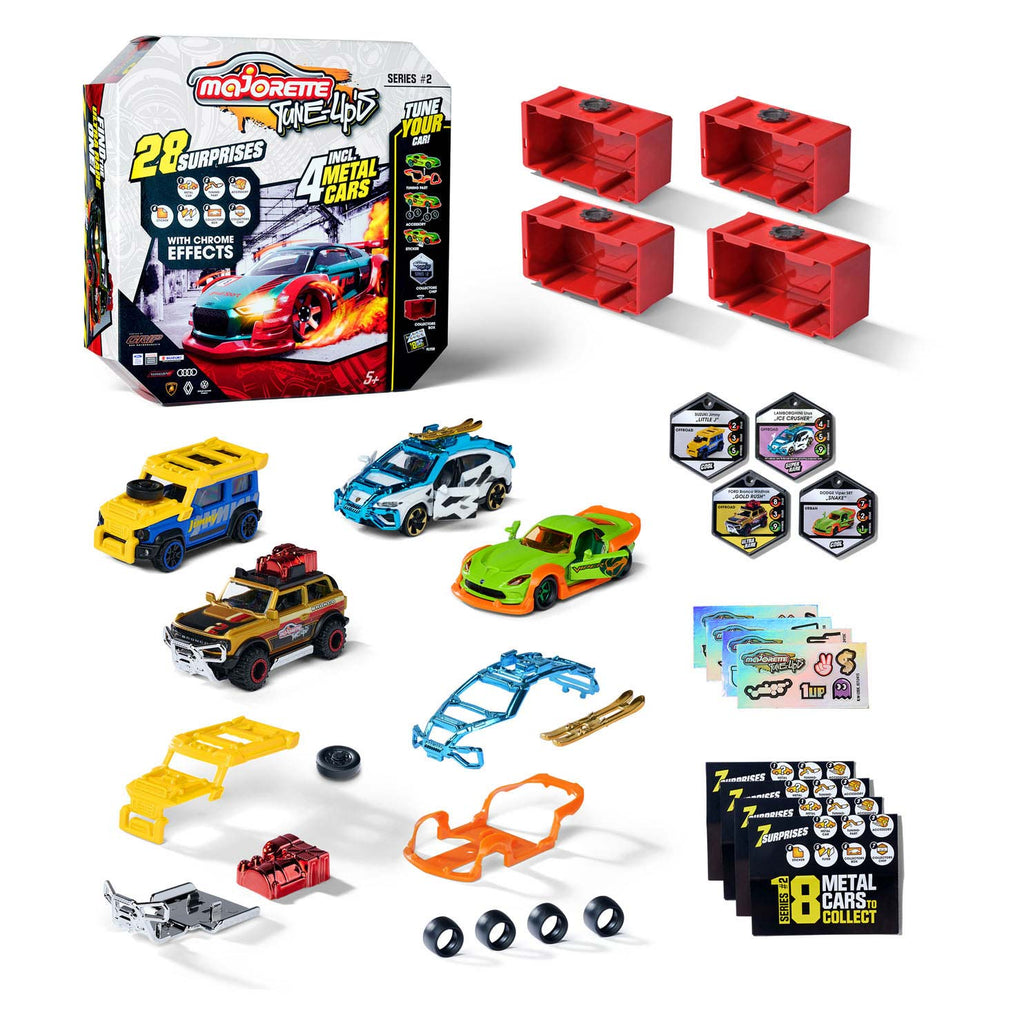 • Majorette Tune Ups ontdekt door "GRIP - Das Motormagazin". Breid je collectie uit met Series 2! Grote spoilers, verrassende bodykits, brede banden en kleurrijke stickers - in elke set van 4 stuks wachten 28 verrassingen om direct door jonge autofans te worden aanbevolen. Elke set bevat 4 van de 18 verzamelwagens. • De collectie omvat 18 modellen in verschillende uitvoeringen, waaronder de Lamborghini Urus, Audi R8 Coupé, Dodge Charger R/T, Volkswagen Golf, Toyota GT86, Renault Megane RS, Toyota Hiace, Suzuki Jimny en de Dodge Viper SRT. Als je geluk hebt, vind je misschien de uiterst zeldzame Ford Bronco Wildtrak met chemische gouden lak, een chromen bodykit en een imperiaal. • Het perfecte cadeau - Of het nu gaat om enthousiaste verzamelaars van modelauto's van jonge fans, deze realistische modellen zijn het perfecte cadeau voor autofans van 5 jaar en ouder en bieden gegarandeerd een opwinding unboxing- en tuning-ervaring. • Ontwerp boordevol functies - Met een metalen chassis, draaiende wielen, ophanging, een subtiel interieur, onderdelen die open kunnen en tuningaccessoires, zijn de voertuigen van 7,5 cm een echte blikvanger. • Uitgebreide accessoires - 28 verrassingen: 4 metalen speelgoedauto's, 4x tuningkits (bodykits), 4 accessoirekits, 4x stapelbare verzamelboxen, 4x verzamelchips, 4x stickervellen, 4x verzamelflyers.