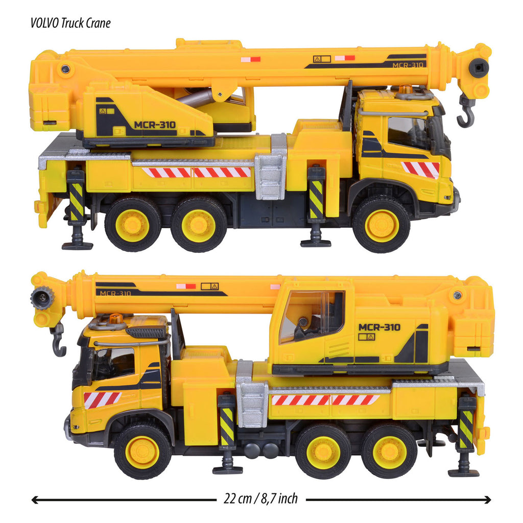 Groot Volvo-bouwvoertuig met uitschuifbare kraan, kabellier en rubberen wielen, licht- en geluidseffecten voor kinderen vanaf 3 jaar.