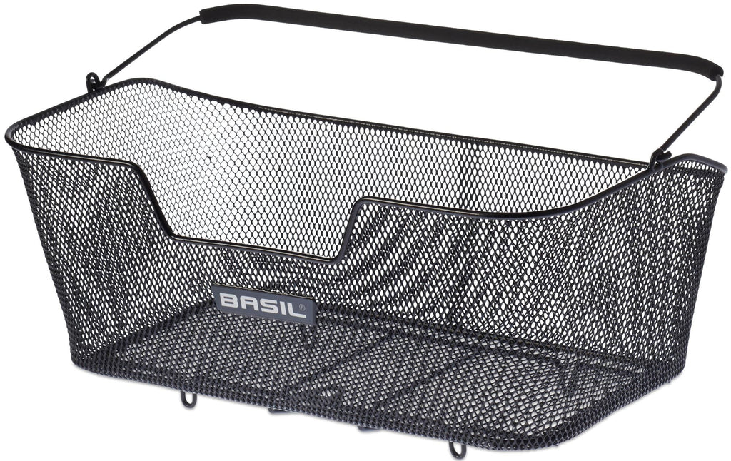 Basilicum Basis XL. Fietsmand extra groot, gemaakt van staal, fijnmazig, achterop de fiets, afneembaar, Soft Grip hengsel, beschermvoetjes, onderstuk voor veerklem, bevestiging dmv haak icm veerklem, breedterichting op bagagedrager, anti-diefstal dmv slotbevestigingsmogelijkheid (slot niet inbegrepen), Zwart.