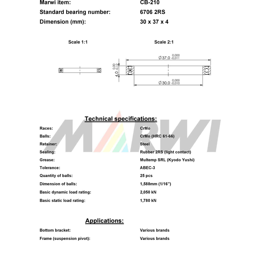 Union Kogellager CB-210 6706 2RS (30x37x4) Presentatieverpakking, groefkogellager voor traplagers, naven, pedalen, derailleurwielen, suspension-draaigewricht Afdichting 2RS Binnendiameter 30.0 mm Buitendiameter 37.0 mm Hoofdkleur zilver Hoogte 4.0 mm Secundaire kleur zwart Type/soort Artikel Type lager kogellager