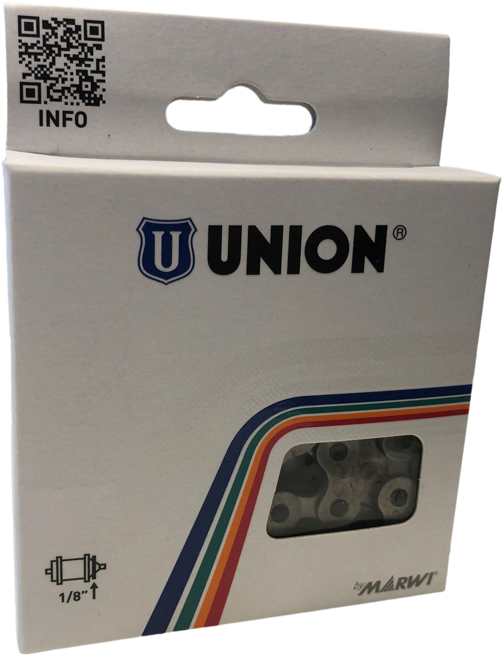 Deze fietsketting van Union is geschikt voor single speed en versnellingsnaaf met 1/8" tandwiel. De ketting heeft een afmeting van 1/2" x 1/8" en een lengte van 112 schakels. De afwerking is zwart en het ontwerp is bush-less. De treksterkte van de ketting is 920 kilogram. De ketting wordt geleverd inclusief snap-on en set UN-33 verbindingsschakel.