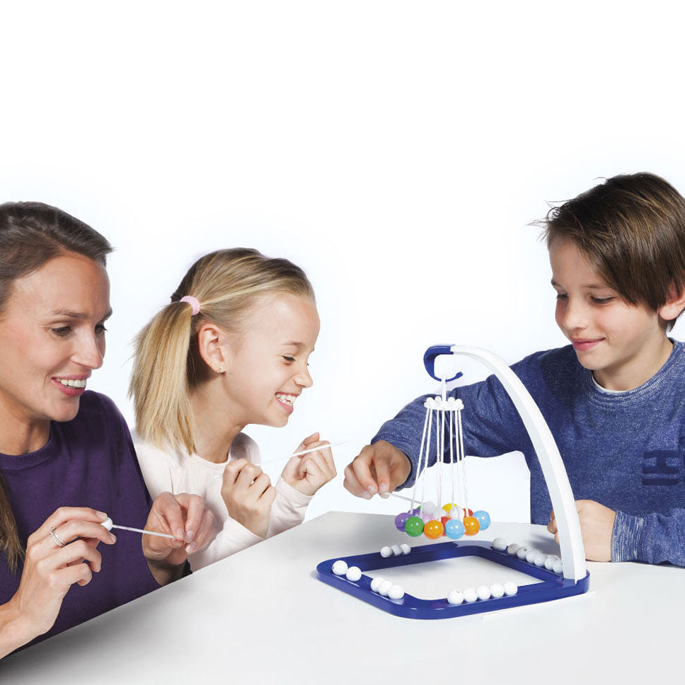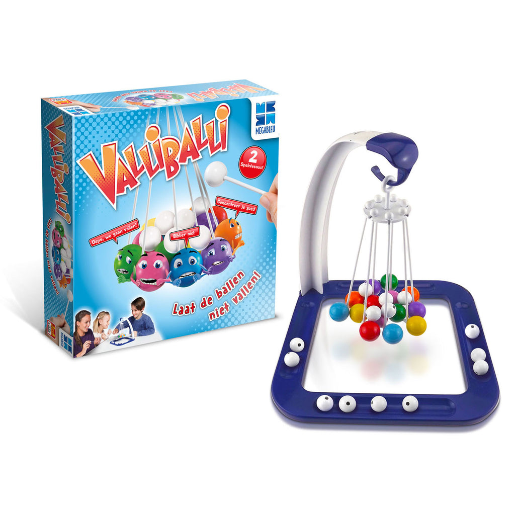 Observatie, controle, strategie en een klein beetje geluk. Dat is waar het om draait bij ValliBalli. Spelers krijgen een aantal witte knikkers (afhankelijk van het aantal spelers) en plaatsen om de beurt 1 knikker bovenop de gekleurde ballen zonder dat er iets valt. Hoe meer witte knikkers er geplaatst worden, hoe zwaarder het gewicht, waardoor er stilaan openingen komen tussen de gekleurde ballen. Wees geduldig en voorzichtig bij het plaatsen van elke knikker, anders… vallen die ballen! De speler die de witte knikkers laat vallen, moet ALLE gevallen knikkers terugnemen. De winnaar is diegene die als eerste al zijn witte knikkers kan plaatsen. 2 spel niveau's dankzij 2 verschillende ringen.