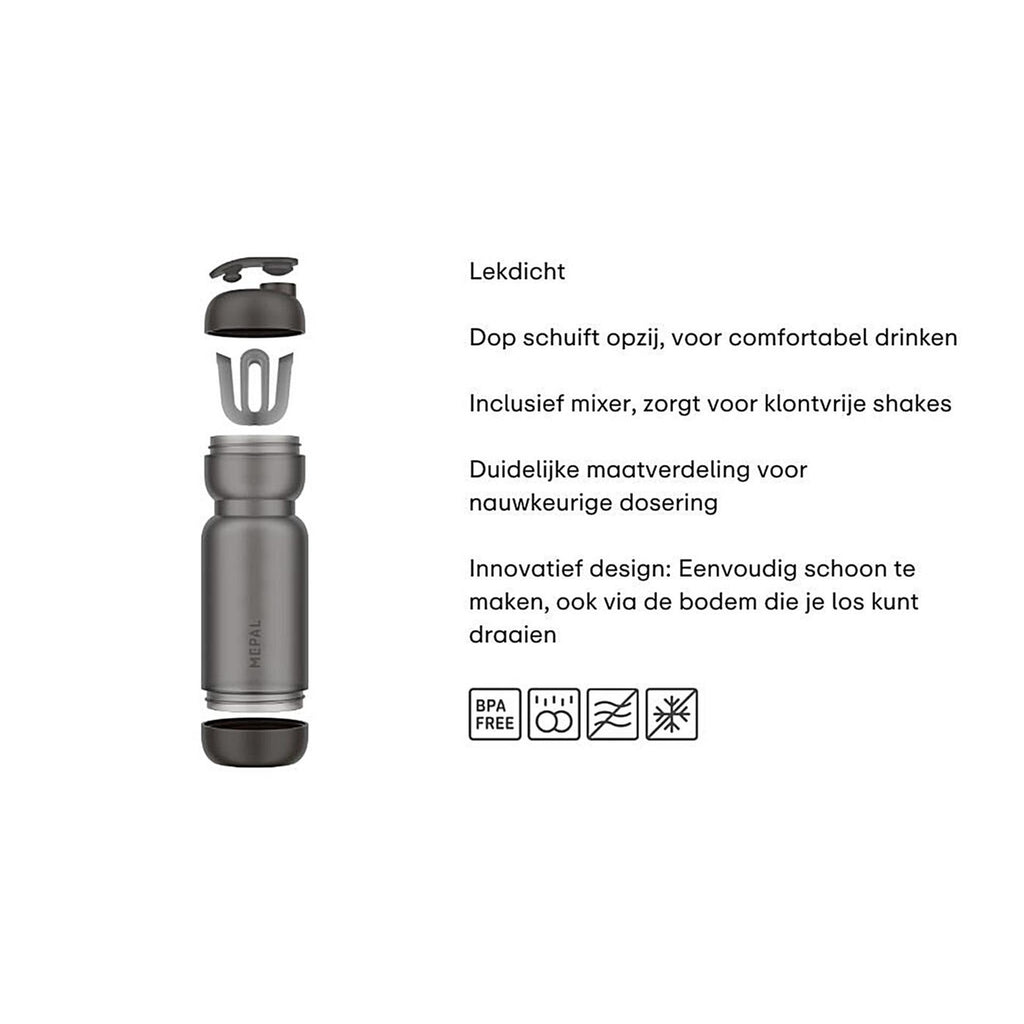 Artikelnummer: 8720294046967 Bekijk alles van Mepal > Bekijk meer: Waterflessen > Mepal Shakebeker 800 ml - Graphite Black Deze sportfles van Mepal is speciaal gemaakt voor (proteïne)shakes en smoothies. Handig om mee te nemen onderweg of naar de sportschool. De beker heeft een ingebouwde mixer en een maataanduiding waardoor je zonder klontjes van je shake geniet. Uiteraard sluit je de fles lekdicht af. Met een handige opzij schuivende dop waardoor je er makkelijk uit drinkt. De onderkant is afneembaar waardoor je de shakebeker nog makkelijker schoonmaakt. Hij mag ook in de vaatwasser! Shakebeker met ingebouwde mixer Lekdicht af te sluiten Handige dop die je opzij schuift Makkelijk schoonmaken dankzij afneembare onderkant Inclusief mixer voor klontvrije shakes Met maataanduiding voor makkelijk doseren Productspecificaties Shakebeker - Graphite Black - 800ml Artikelomschrijving Shakebeker - Graphite Black - 800ml Artikelnummer 8720294046967 Uitvoering Graphite Black Inhoud (ml) 800 Kleur Zwart Materiaal Kunstof BPA-vrij, Siliconen