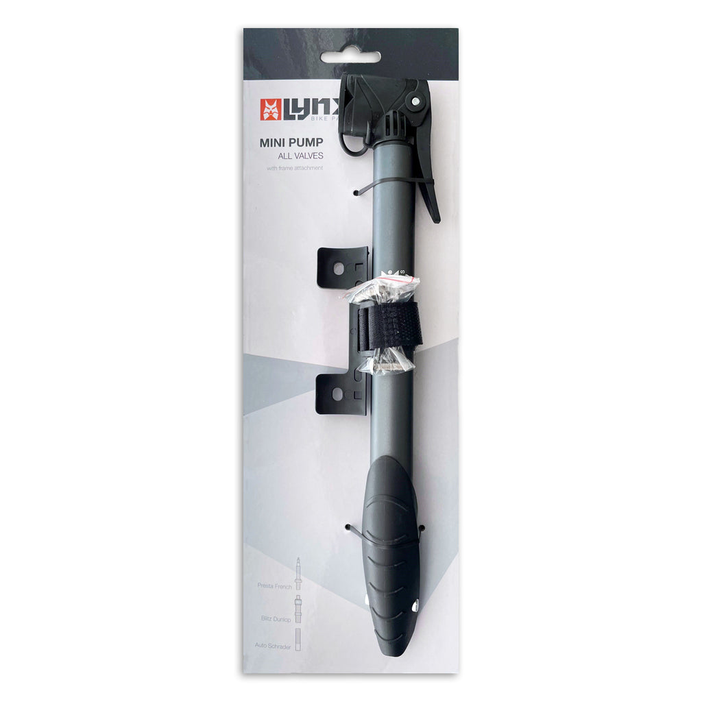 Deze aluminium fietspomp van Lynx is een compacte en handige pomp die geschikt is voor alle ventielen, waaronder Dunlop-, Presta- en Schrader-ventielen. Met zijn inklapbare T-handvat biedt deze pomp optimaal gebruik. Daarnaast is de pomp eenvoudig mee te nemen dankzij de dubbele montagebeugel. Deze beugel kan eenvoudig worden bevestigd op de bidonhouder.