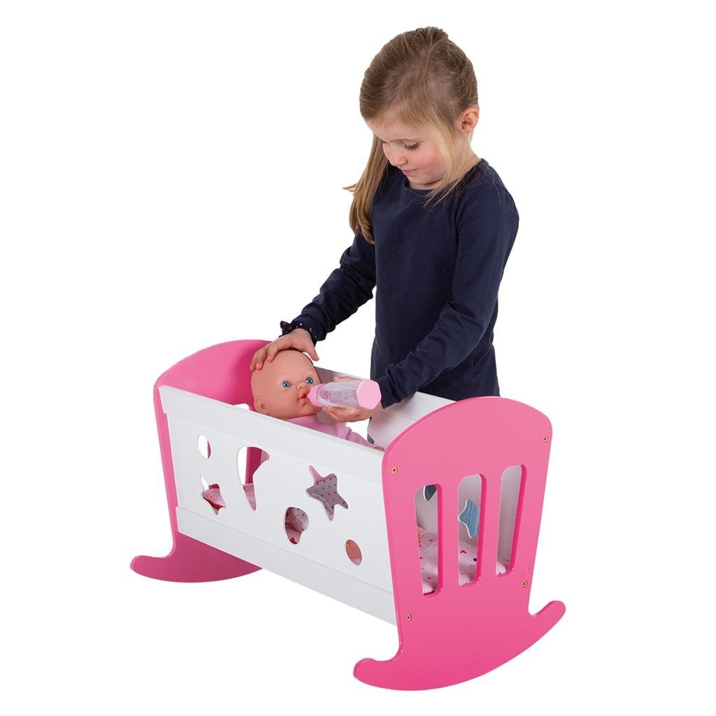 Wieg je pop lekker in slaap met dit schommelbed. Leg haar op het matras en met haar hoofdje op het kussentje, dek haar teen met het dekentje en schommel haar zacht heen en weer. Binnen no-time zal ze heerlijk liggen te slapen! Dankzij de mooie bevruchten aan de zijkant van dit houten bedje kan je pop in de gaten houden en kan zij jou ook zien.