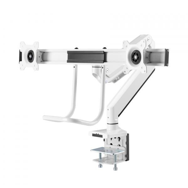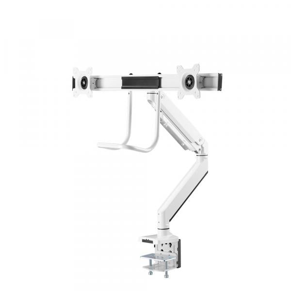 Met deze Neomounts monitorarm met hendel, model NM-D775DXWHITE, kunt u twee flatscreens aan het bureau bevestigen via een bureauklem.