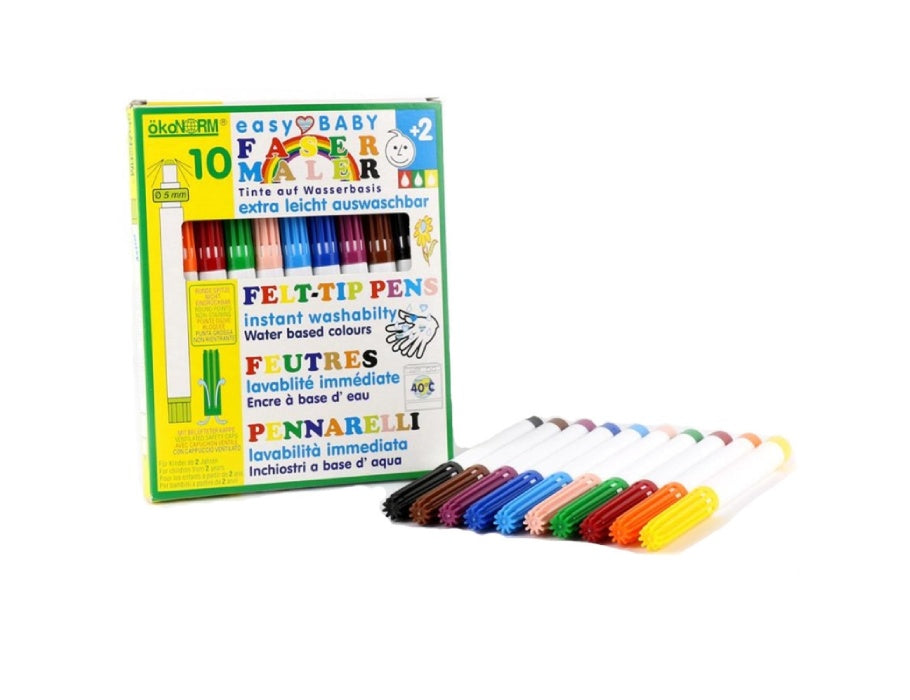 Artikelnummer: 4019427720077 Bekijk alles van ökoNORM > Bekijk meer: Knutselspullen > Ökonorm - easy baby Viltstiften - uitwasbaar - 10 stuks De Ökonorm viltstiften hebben een lijndikte van 5 mm en zijn gemakkelijk uitwasbaar. De verpakking bevat 10 verschillende kleuren en elke pen heeft een gegeventileerde veiligheidsdop. De effectieve, duurzame kleuren zijn geschikt voor zelfs de kleinste kunstenaars vanaf 2 jaar onder toezicht van volwassenen. De speciale veiligheidslaktip kan niet worden gedeukt. De kleuren zijn op waterbasis, gemakkelijk uitwasbaar en uit de meeste textielsoorten uitwasbaar op 40°C. Ze lijken nauwelijks, zijn formaldehydevrij en bevatten geen schadelijke stoffen (pH rond de 6). De waarden liggen ruim onder de Euronorm EN 71, deel 9. De verven zijn een waterige emulsie met onschadelijke kleurpigmenten. Ze voldoen aan de Europese norm EN 71/1-2-3-9 en de Amerikaanse norm ASTM D 4236 voor de veiligheid van kinderspeelgoed. Gevaar! Houd kinderen jonger dan 3 jaar onder toezicht Productspecificaties easy baby Viltstiften - uitwasbaar - 10 stuks Artikelomschrijving easy baby Viltstiften - uitwasbaar - 10 stuks Artikelnummer 4019427720077 Land van herkomst Duitsland Afmetingen (lengte x breedte x hoogte): 13,00 x 1,40 x 15,60 cm De verven zijn een waterige emulsie met onschadelijke kleurpigmenten. De kleuren zijn glutenvrij. Ze voldoen aan de Europese norm EN 71/1-2-3-9 en de Amerikaanse norm ASTM D 4236 voor de veiligheid van kinderspeelgoed. Let op!: Kinderen jonger dan 3 jaar moeten onder toezicht staan van volwassenen.