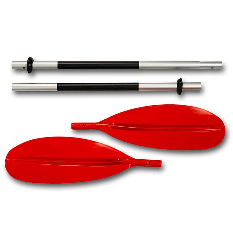 Een kajakpeddel met een aluminium stalen en kunststof peddelbladen. De peddel kan gemakkelijk worden meegenomen omdat hij uit elkaar kan worden gehaald tot vier verliezen delen. Met drie verschillende gaatjes kun je de ideale peddelstand kiezen door de twee delen van de peddelsteel enorm te klikken. De peddel is voorzien van druipringen die voorkomen dat water vanaf de peddelbladen langs het staal naar beneden loopt.