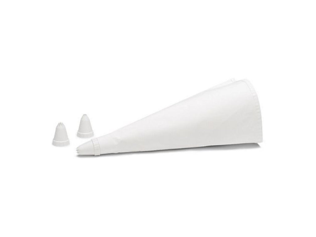 Patisse Spuitzak met 3 spuitmondjes 28 cm. Patisse spuitmond van 28 cm, gemaakt van wit katoen, met 3 verschillende kunststof spuitmondjes. Voor het decoreren van taarten en gebak.