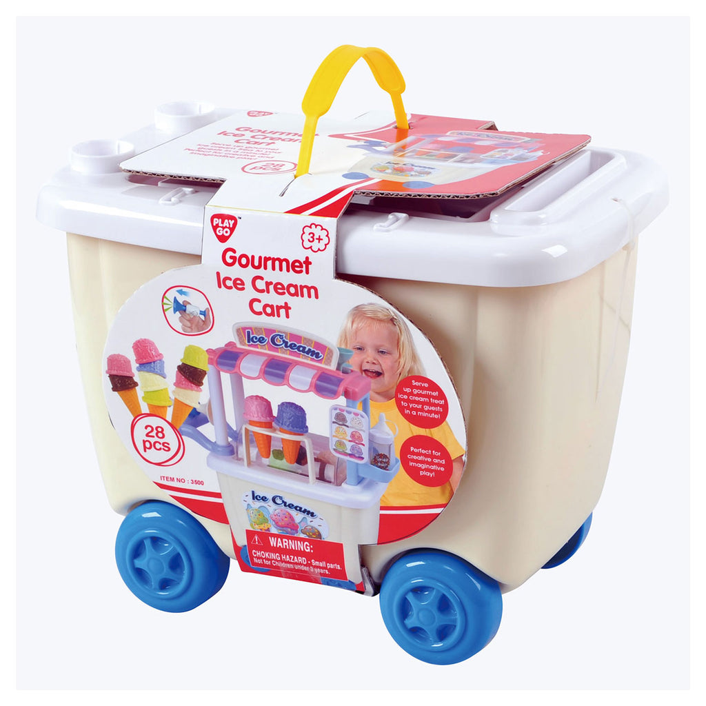Begin je eigen ijskraam met deze speelset van Play. Duw de ijskar door het park en druk op de hoorn om te laten weten dat je er aan komt. Stal de 6 verschillende soorten ijs en de 2 toppings uit en laat de klanten kiezen. Met behulp van de ijsschep serveer je de bolletjes op het hoorntje of in een luxe coupe. Dankzij de luifel blijven je ijsjes lekker koel!