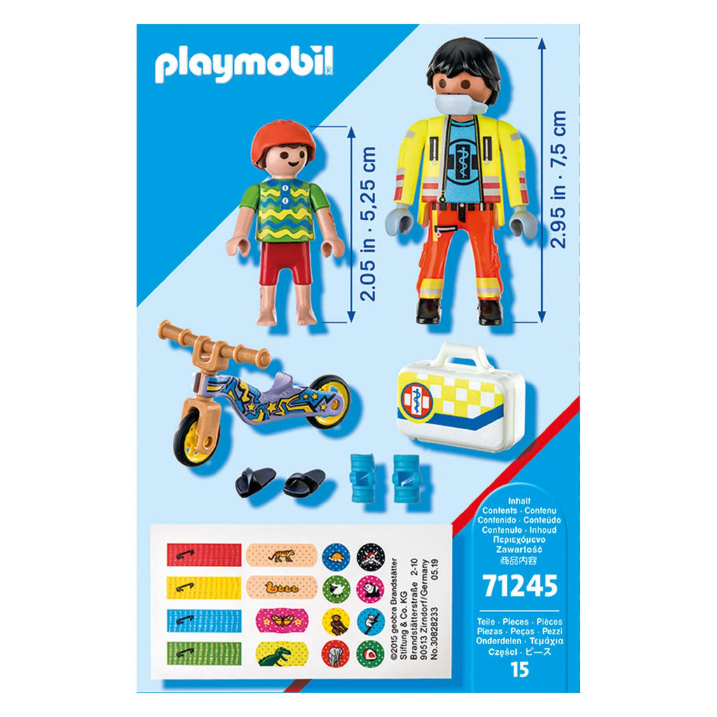 De paramedicus lapt de gewonde jongen op met pleisters en een spalk! De zorgzame paramedicus staat altijd klaar om te helpen. Voor de eerste hulp bij blessures heeft hij zijn EHBO-doos met spalken en veel verband bij zich. Hij behandelde de wond van de verdachte jongen zorgvuldig en doet een spalk om zijn geweest. De grappige dinopleister brengt de kleine patiënt in een mum van tijd weer aan het lachen. De speelgoedset voor kinderen vanaf 4 jaar bevat twee PLAYMOBIL-figuren, een scooter, een EHBO-doos, EHBO-spalken, een helm en andere extra's. Wonden kunnen worden behandeld met de bijgeleverde pleisterlabels. De "verwondingen" op de arm en het zijn van het soort zijn gemaakt van warmtegevoelige verf die verdwijnt bij verlicht en weer zichtbaar wordt na afkoeling. Gezichtsmasker, helm en pantoffels zijn afneembaar. De PLAYMOBIL City Life-serie omvat moderne voertuigen en realistische personages waarvan kinderen belangrijke vaardigheden kunnen ontwikkelen en zich kunnen onderdompelen in spannende rollenspellen.