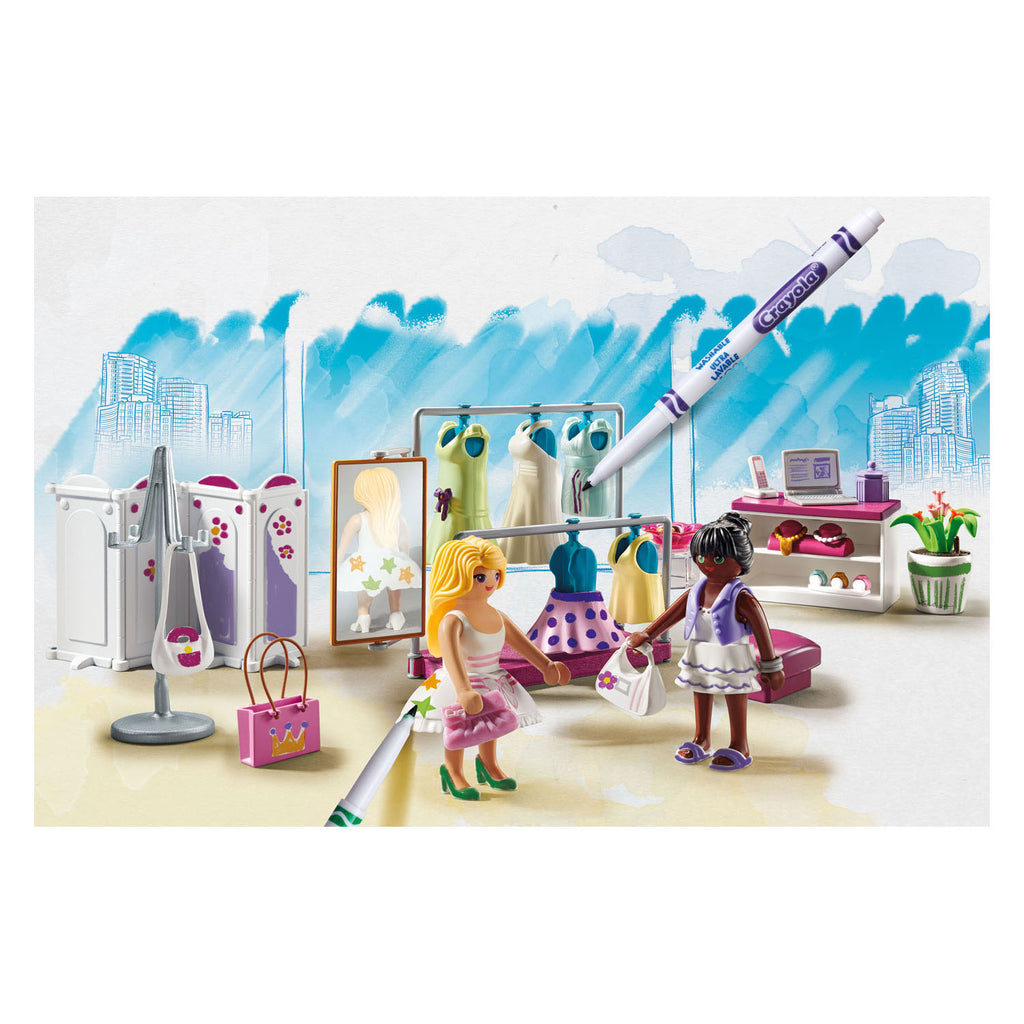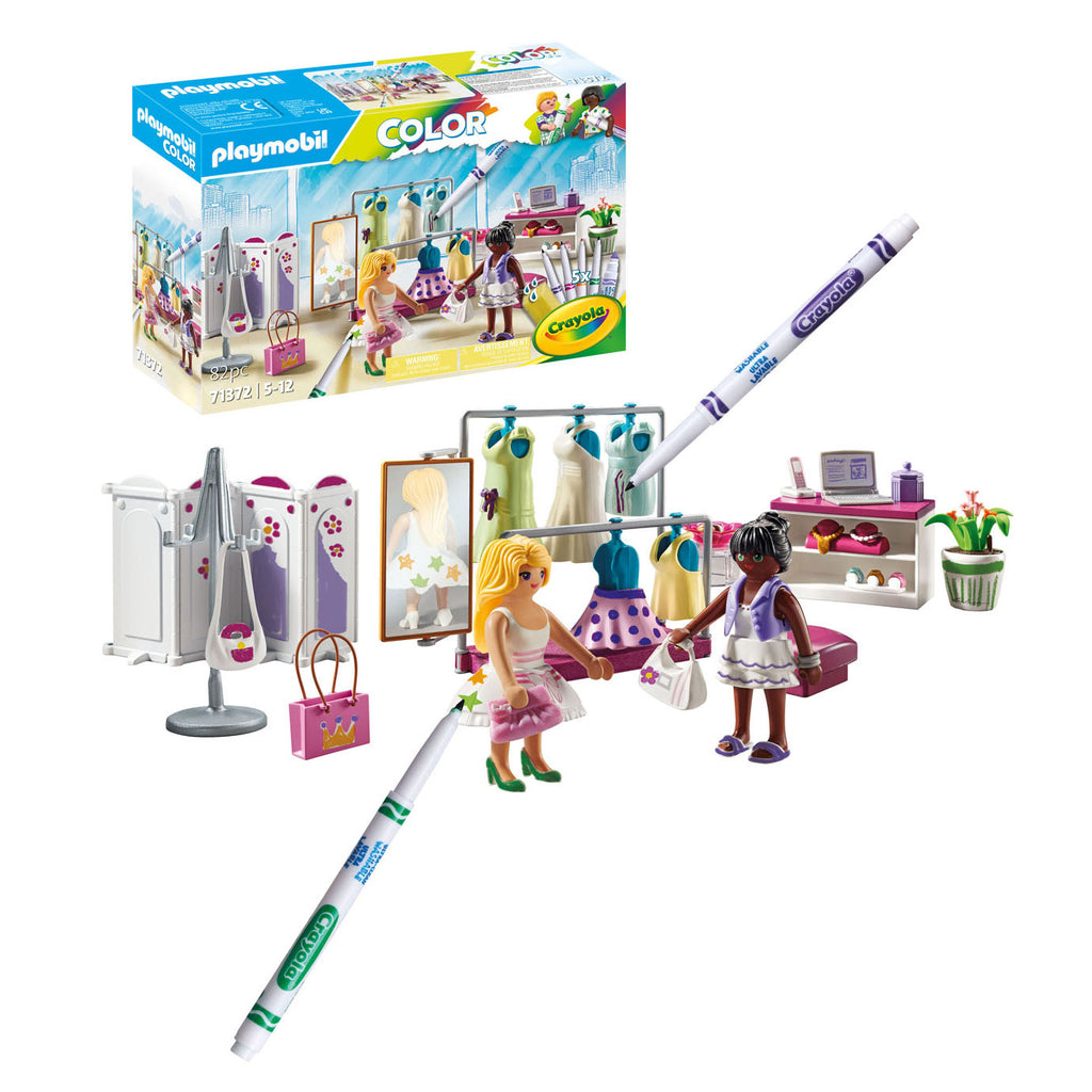 Breng kleur in het spel met PLAYMOBIL Kleur! In de modewinkel zijn er veel geweldige kleding en accessoires in elke modestijl te vinden. Gebruik de 5 uitwisbare stiften om de outfit voor je figuur te ontwerpen zoals je wilt. De witte basisschijf laat maximale ruimte voor alle creatieve ideeën. De kleur was gemakkelijk af - voor eindeloos plezier. Inhoud: 82dlg.