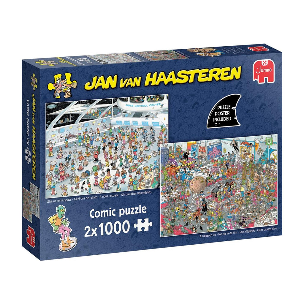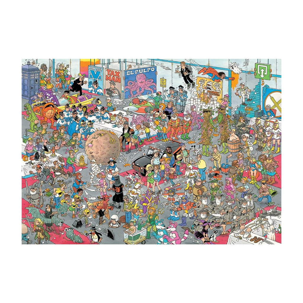 In deze 2 - in - 1 puzzel nemen we een kijkje in de toekomst en in de wereld van comicon! Stap in de tijdmachine en reis mee naar een wereld vol sterren en technologie: hoe zou een ruimtestation er in de toekomst uitzien? En in wat voor bizarre, futuristische wereld zal de Jan van Haasteren - familie straks ronddwalen? De familie van Jan van Haasteren duikt in de betoverende wereld van comics, manga, cosplay, gaming, films, series, sci - fi, fantasy en nog veel meer. Overal waar ze kijken: verklede helden, bizarre wezens en onverwachte avonturen. Kortom… de ultieme geek ervaring!