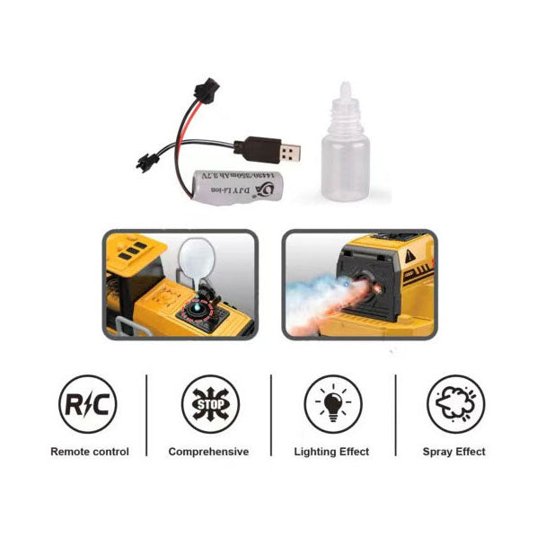 Radiografisch bestuurbare voorlader met lichteffect en stoomeffect. De graafmachine werkt met een accu (inbegrepen) en de controller werkt op 2 AA batterijen (niet inbegrepen). Afmetingen: 23,5 x 10,5 x 10 centimeter. Geschikt vanaf 3 jaar.