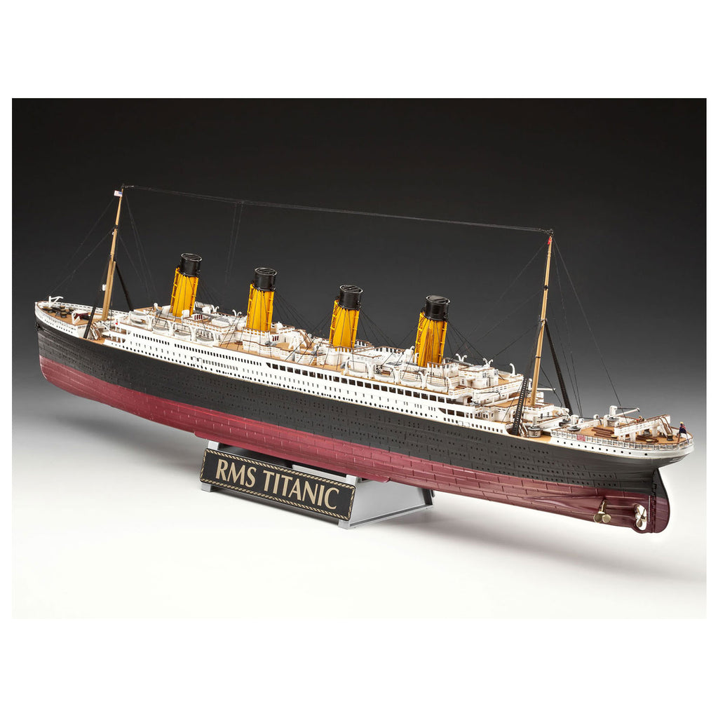 De Titanic, het meest opmerkelijke schip ooit. Bouw met deze Revell modelbouwset de Titanic met wel een lengte van 67 cm. In deze speciale geschenkset editie krijg je naast de bouwonderdelen ook nog 5 reproducties van historische documenten van de Titanic, waaronder 3 postkaarten, 1 print van een eersteklas menu en 1 print van een brochure over de Titanic. Op de achterkant van de doos staat een complete tijdlijn vanaf het moment dat de Titanic fysiek wordt tot aan de ondergang en de ontdekking van de wrakstukken. De modelbouwset bestaat uit 262 onderdelen, heeft een schaal van 1:400 en een moeilijkheidsgraad van 5 sterren. Inclusief lijm, verf en verfbenodigdheden.