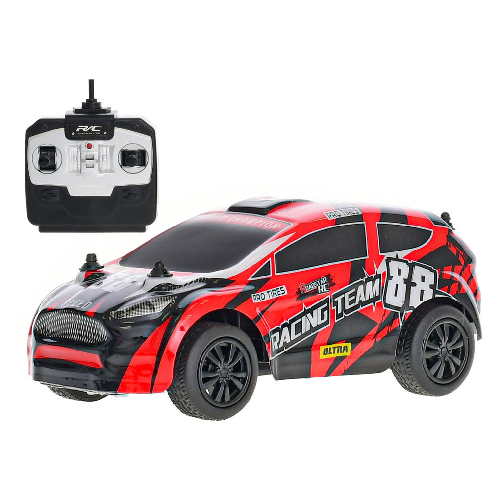 Op afstand bestuurbare Roadstar rallyauto in rood met zwart. Afmeting: 14 cm. Geschikt voor kinderen vanaf 3 jaar oud.
