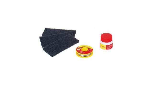 Zachtsoldeerset.Basisuitrusting voor drinkwaterinstallaties:BelgoStat - reinigingspads, vloeimiddelpasta, drinkwaterleidingen zacht solderen. Inclusief 3ROVLIESpads, Rosol 3 100 g, 3100 g montagesoldeer.