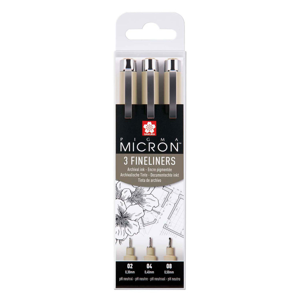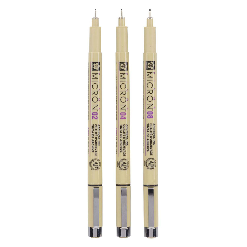 Set van 3 van de meest populaire Pigma Micron-pennen: Pigma Micron 02 0,30 mm, Pigma Micron 04 0,4 mm, Pigma Micron 08 0,5 mm.