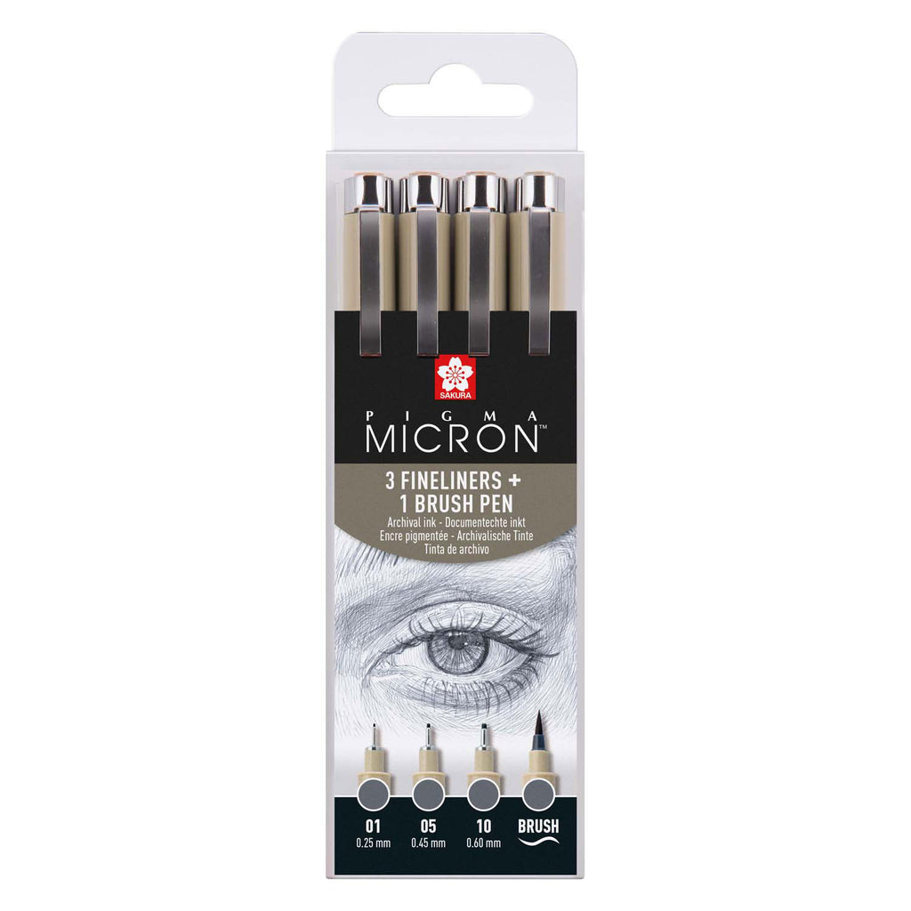 Selectie van 4 Koelgrijze Pigma Micron en Brush pennen: Pigma Micron 01 (0,25 mm), Pigma Micron 05 (0,45 mm), Pigma Micron 10 (0,60 mm) en Pigma Brush. met deze opbouwbare grijstinten kun je schaduwen, diepte, visuele accenten en lagen toevoegen aan illustraties, tekeningen, bullet journal spreads en nog veel meer.