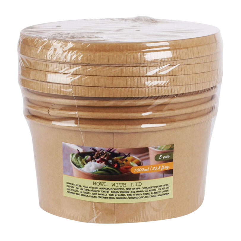 Set van 5 discrete schaaltjes met deksel. De schaaltjes hebben een inhoud van 1000 ml (1 liter) en zijn ca. 14,5 centimeter groot.