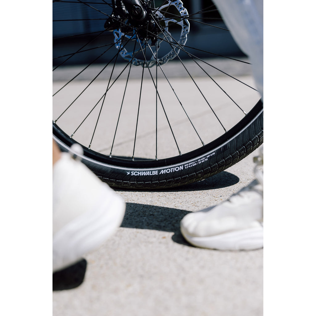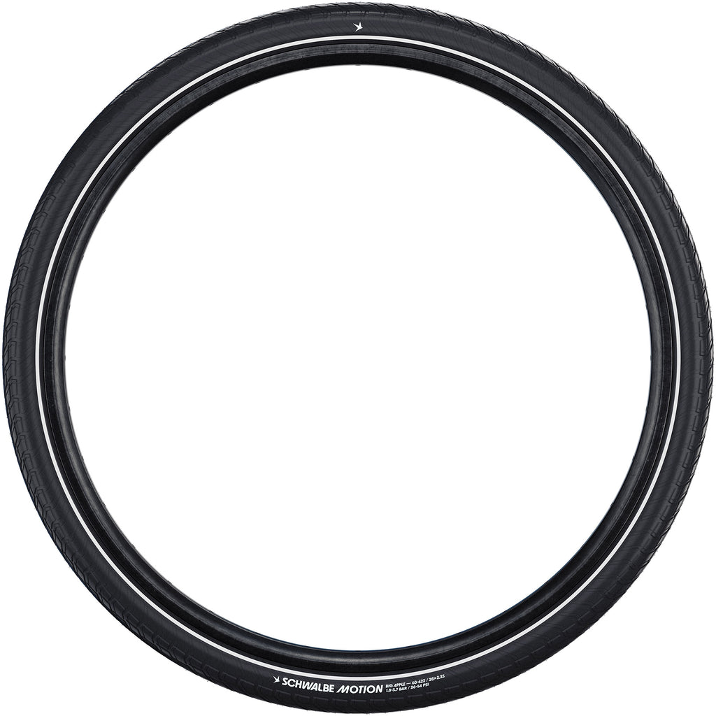 De Motion Big Apple is de directe opvolger van de Big Ben en het voorgangermodel van de Big Apple. De milieuvriendelijkheid van de band: - Addix Green: Schwalbes meest milieuvriendelijke rubbermengsel met behoud van prestaties, bevat 80% hernieuwbare grondstoffen en gerecyclede materialen: - Onder andere maakt hij 100% gebruik van gerecycleerde roet (recovered Carbon Black, rCB) uit Schwalbes Tire-recycling. - Wordt voor 100% gemaakt van fairtrade natuurlijk rubber. Comfort en demping De Schwalbe Motion Big Apple absorbeert met lage luchtdruk elke oneffenheid en rolt soepel over asfalt, maar ook over bospaadjes. Hij staat voor absoluut comfort en dempt dankzij zijn grote volume elke schok – helemaal zonder ingewikkelde veringstechniek. Het veelzijdige profielontwerp bevat moderne designelementen die ook terug te vinden zijn in de zijwandstructuur van de Motion Big Apple. Toepassingsgebied De Motion Big Apple is geschikt voor e-bikes in het touring- en stedelijke segment, maar ook voor trekking- en stadsfietsen zonder motor. Voor de dagelijkse routes naar het werk, maar ook voor klassieke fietstochten. Ook voor kinder- en jeugd fietsen en lichte niet-gemotoriseerde cargofietsen is de Big Apple een goede keuze.
