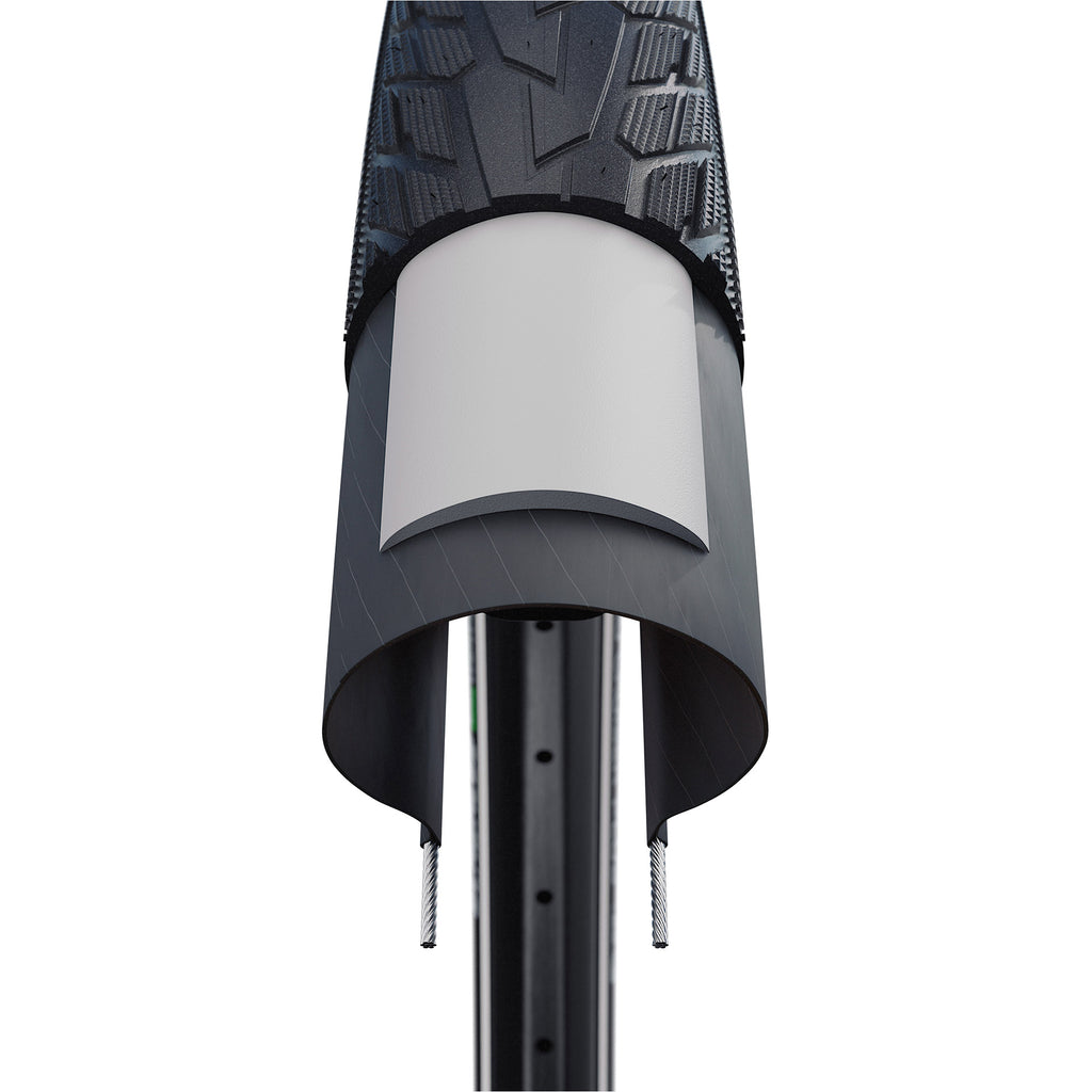 Schwalbe buitenband Road Cruiser is een urban en dynamische band met een aangenaam profieldesign. Het meest opvallende kenmerk van deze band is het Green Compound loopvlak, gemaakt van hernieuwbaar en gerecycled materiaal. De band is uitgerust met de effectieve PunctureGuard lekbescherming. Specificaties: - Primaire basiskleur: Zwart - Type: Road Cruiser - Gebruik: Stad - Reflectie: Ja - Vouwbaar: Nee - ETRTO: 47-559 - Geschikt voor tubeless: Nee - Inchmaat: 26 - Maximale druk: 5 - Keurmerk E-bike: E-Bike tot 25 km/h - Rolweerstand: Midden