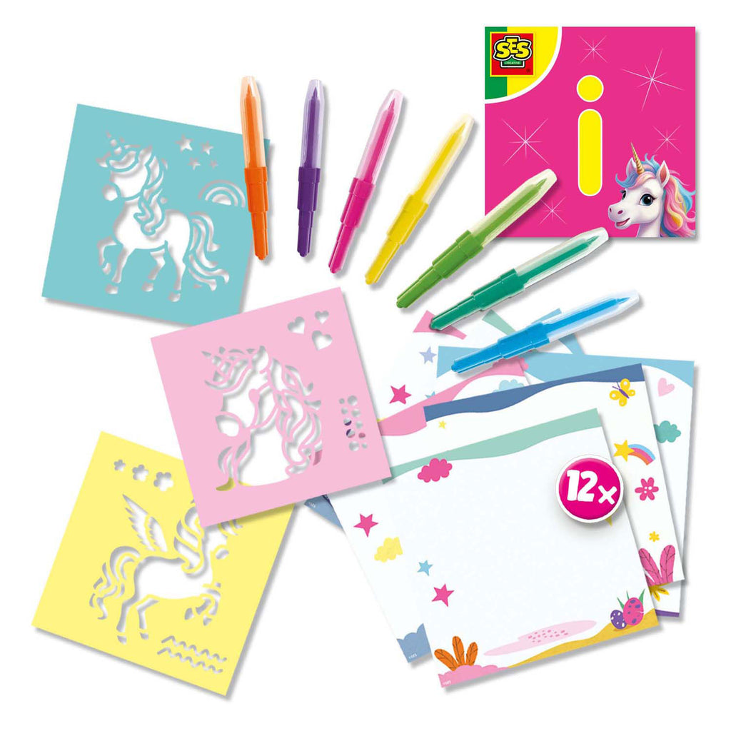 Op zoek naar een gezellige knutselactiviteit voor echte eenhoornliefhebbers? Ga dan creatief aan de slag met de Blow airbrush pens unicorn set.De 12 kleurplaten wachten om prachtig versierd te worden. Met de drie unicorn sjablonen en blaas airbrush viltstiften in 7 kleuren kunnen de mooiste kunstwerken worden gemaakt.Gebruik de stiften als gewone viltstiften of plaats ze in de houders om de meest mooie spray effecten en kleurovergangen te maken.Het eenvoudig en gebruiksvriendelijke systeem is perfect voor kinderen die van knutselen houden.