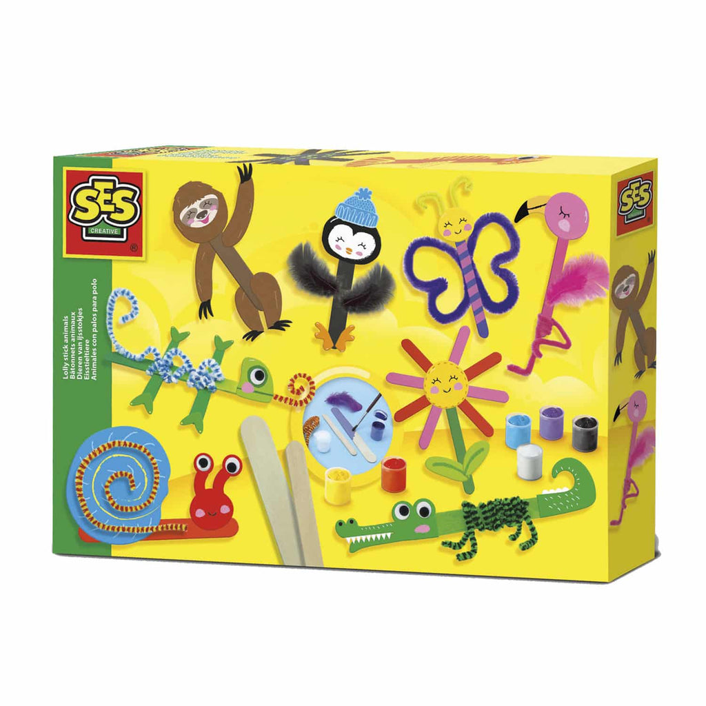 SES creatieve dieren van ijsstokjes. Met deze knutselset van SES Creatieve knutsel je de leukste dieren van ijslollystokjes. Met behulp van de handleiding maak je in een handomdraai een vrolijke flamingo, slaperige luiaard of gevaarlijke krokodil. Verf de ijslollystokjes en plak de bijgeleverde papieren vormpjes, veren, wiebeloogjes en het chenilledraad erop. Advies leeftijd vanaf 3 jaar.