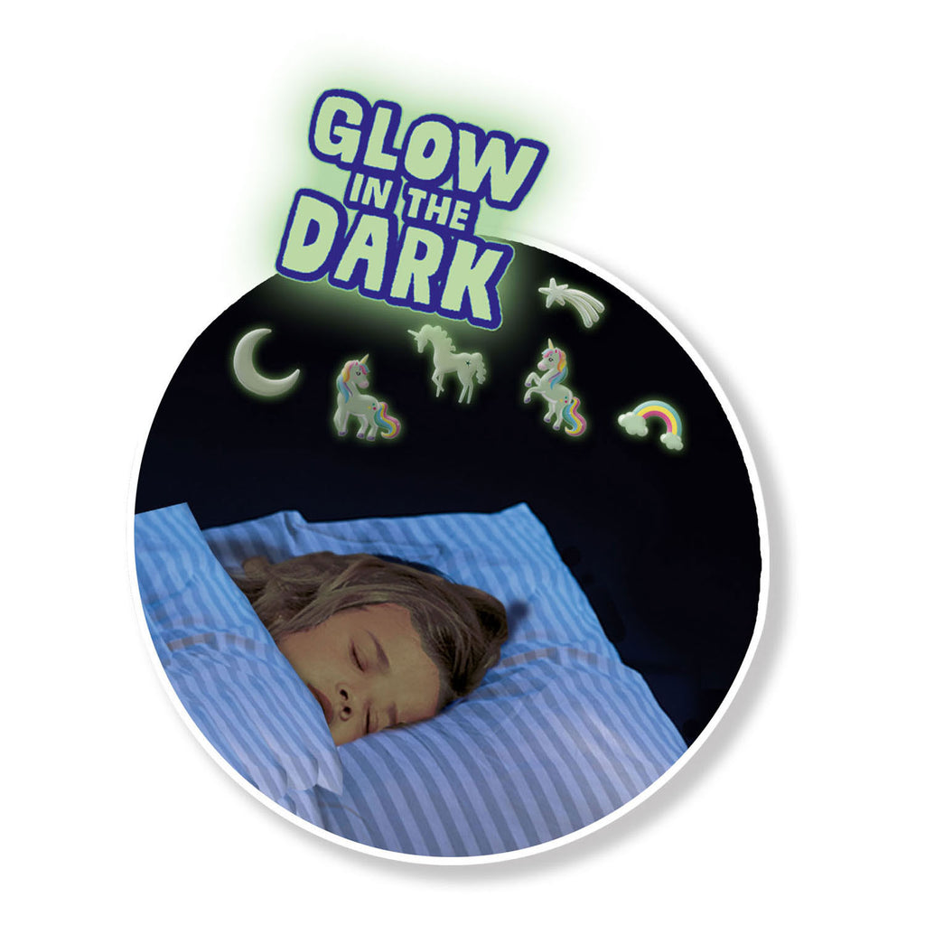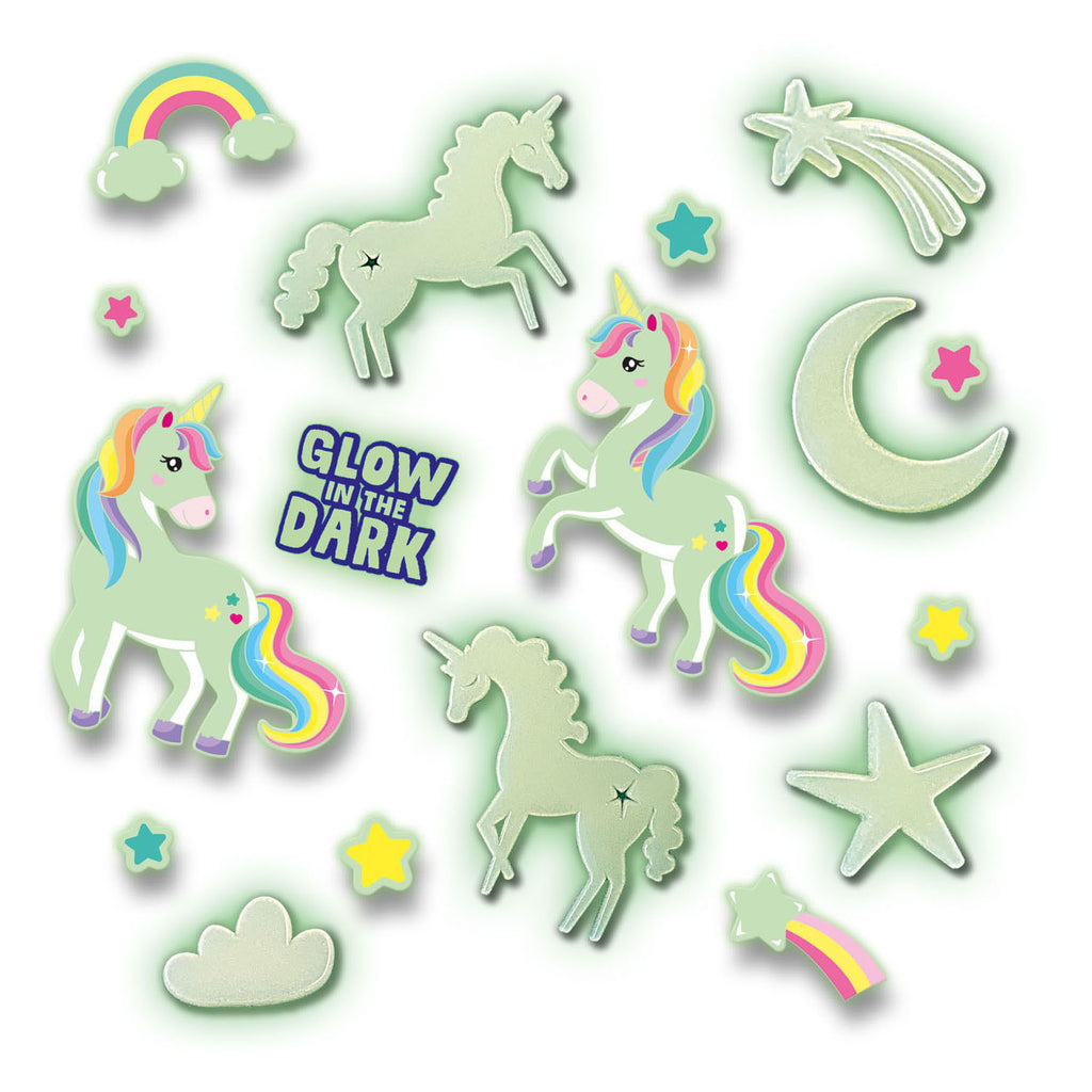 Met deze Glowing unicorns word jouw slaapkamer magisch als het donker wordt! Plak de stickers op de Glowing unicorns en maak jouw eigen fantasie, zo op je muur of plafond. Als het donker wordt lichten ze één voor één prachtig op. Deze set bestaat uit 4 kunststof unicorn vormen met dubbelzijdige foam plakkers waarmee je ze kunt bevestigen. Daarbij krijg je 20 glow in the dark sterren, manen en wolkenstickers. Geef een extra dimensie aan jouw Eenhoorns door ze naar jouw smaak te beplakken!