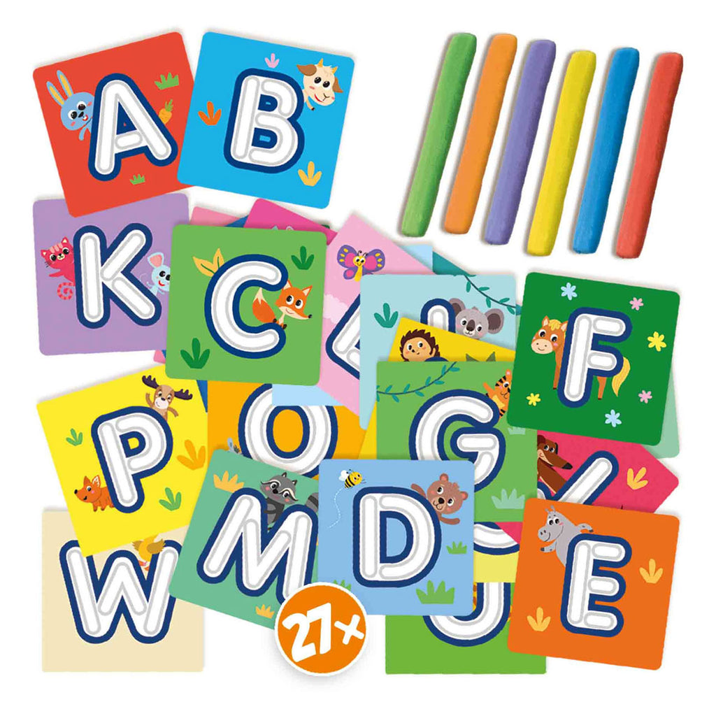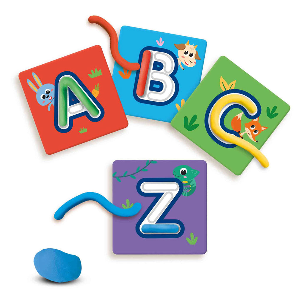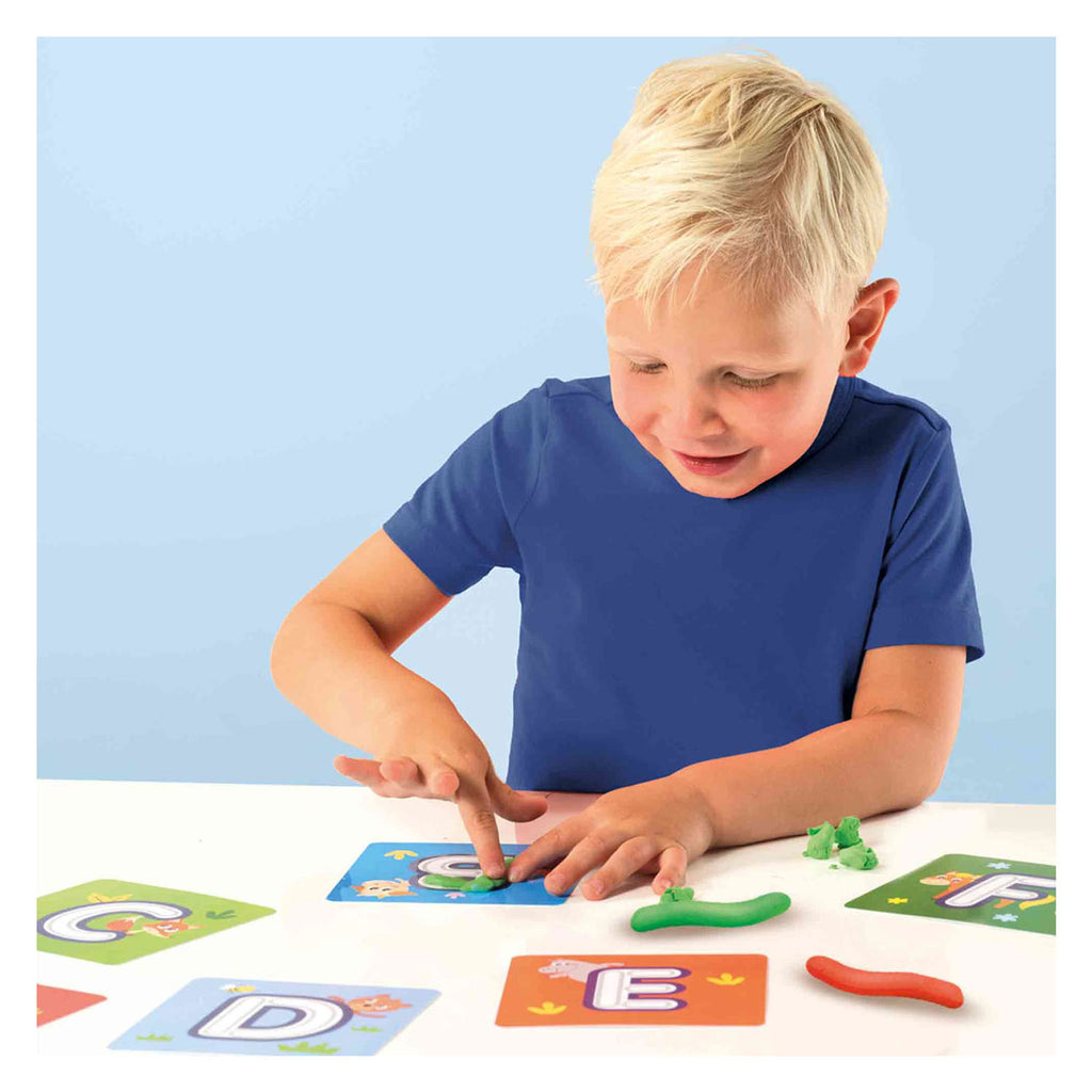 Het ABC is nog nooit zo gemakkelijk geweest om te leren. Kinderen kunnen actief bezig gaan met de letters en spelenderwijs het alfabet ontdekken. Iedere brief staat op een aparte kaart. Met de 6 kleuren boetseerklei kunnen de kinderen één voor één de letters kleien. Met de verschillende letterkaarten op een rij zijn zelfs korte woorden of namen te maken.
