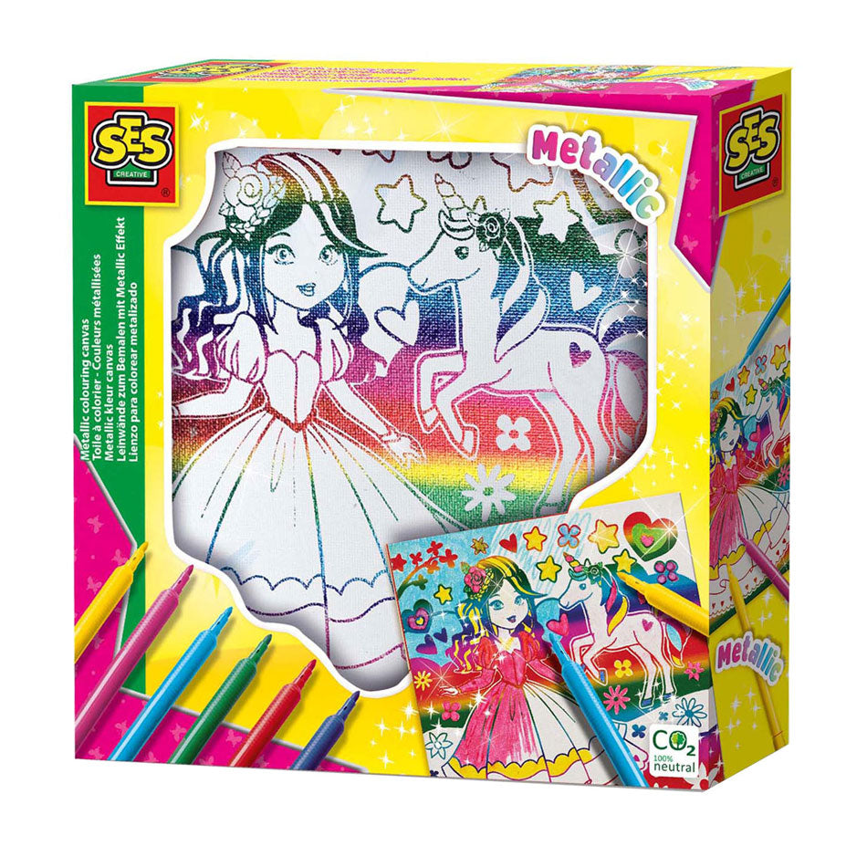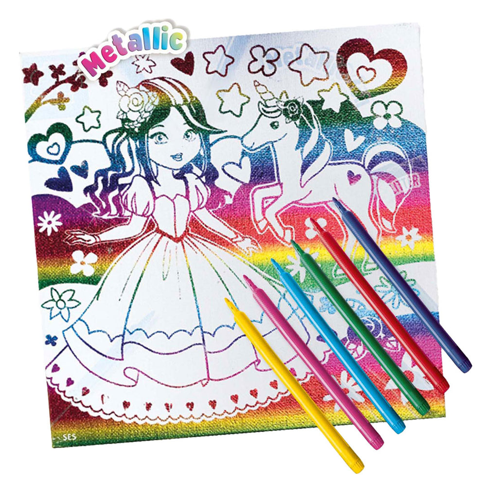 Metallic Kleur Canvas: Maak een Schitterend Kunstwerk! Met de SES Creative **Metallic Kleur Canvas** set kun je een prachtig kunstwerk maken met een geweldig metallic effect. Deze stevige canvasdoek is voorzien van een mooie metallic achtergrond en wacht erop om gekleurd te worden. Gebruik de bijgeleverde viltstiften om je creativiteit de vrije loop te laten en een uniek kunstwerk te creëren!Inhoud van de Verpakking Canvas met metallic effect 6 viltstiften Schitterende Kleuren en Creatief Plezier Het metallic canvas heeft een glanzend effect dat je kunstwerk extra speciaal maakt. De meegeleverde viltstiften zijn perfect voor de verschillende delen van het canvas in de kleuren. Of je nu betrouwbare kleuren kiezen of gedeeltelijk, het tinten metallic effect geeft je creatie een sprankelende uitstraling!Waarom deze set geweldig is Deze set is perfect voor kinderen die van tekenen en kleuren houden en hun kunstwerken naar een hoger niveau willen tillen. Het stevige canvas en de metallic glans zorgen voor een duurzaam en indrukwekkend resultaat. Bovendien is het een leuke en ontspannende activiteit die creativiteit en fijne motoriek stimuleert. Hoe Werkt Het? Kies een viltstift en begin met de kleuren van het metallic canvas. Het goedkope effect zorgt ervoor dat je kleuren nog actiever uitkomen. Je kunt je creatie ophangen zodra deze klaar is en trots is op je prachtige kunstwerk!Klaar om Te Kleuren? Pak de **Metallic Kleur Canvas** set van SES Creative en maak een schitterend kunstwerk dat je met trots kunt laten zien. Laat je creativiteit stralen en ontdek de magie van metallic kleuren!