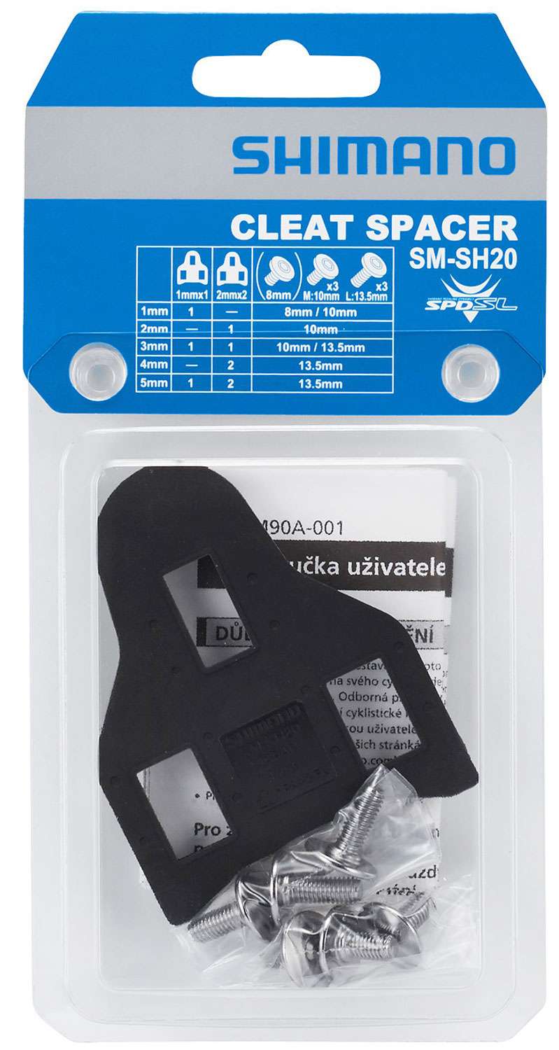 De schoenplaat spacers van Shimano helpen een evenwicht in de pedaalbalans te neutraliseren. Ze worden onder de schoenplaatjes gemonteerd zodat de ene voet iets hoger op het pedaal komt dan de andere. Zo kunnen verschillen in beenlengte worden opgevangen.