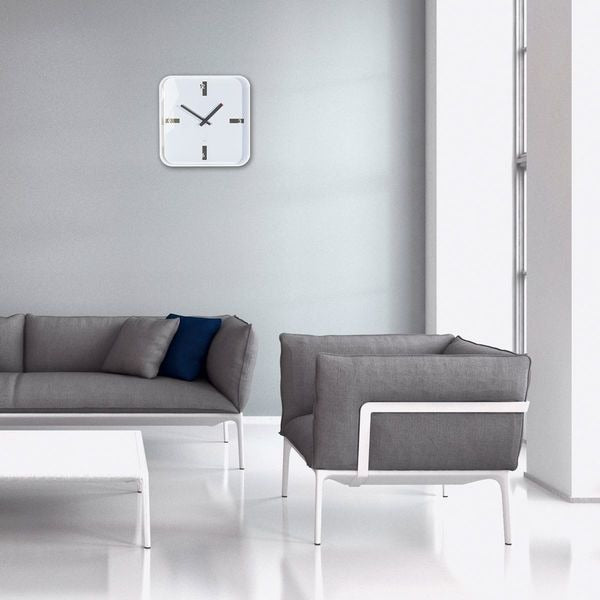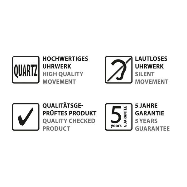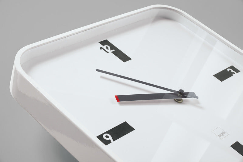 Kwalitatief hoogwaardige wandklok in modern app-formaat. Hoogwaardige voorkant van mineraalglas in combinatie met een ABS-kunststofkast in hoogglans. Puristisch uitgevoerde wijzerplaat met grijze blok-elementen. Geometrische wijzervorm in donkergrijs. De urenwijzer met rood designaccent. Geruisloos uurwerk en geluidloze wijzers. Afmeting 350 x 350 x 45 mm. Kleur wit. Loopt op 1 x 1,5V AA-batterij (niet meegeleverd). Garantie; 5 jaar-www.sigel.de/garantie
