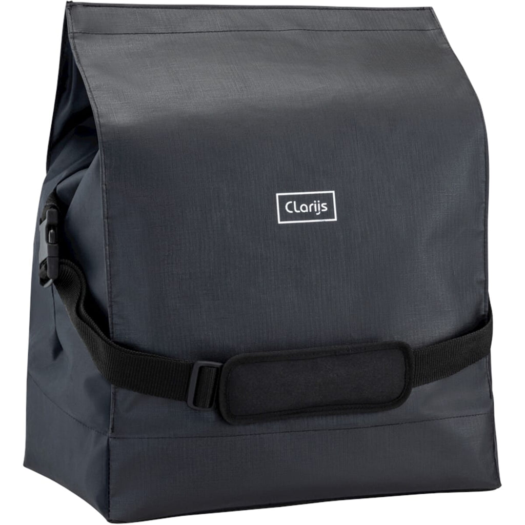 De Front bag is een handgemaakte multifunctionele fietstas, speciaal gemaakt voor bagagedragers. De tas heeft een handvatten aan de bovenkant en een draagbare schouderriem, net als de Clarijs Solobag. Dit maakt de tas erg handig voor meerdere doeleinden. Het sluitsysteem van de voortas is opgenomen met een magnetische band, waardoor de tas vrijwel gemakkelijk te openen en te sluiten is, perfect geschikt voor het doen van boodschappen. De bodem en afgedekt zijn verstevigd met gerecyclede plastic plaat voor extra stevigheid. De Front-tas is gemaakt van drie verschillende materialen, Bisonyl PVC, gecoat acryl en Rivertex voor de uitvoering. Bisonyl PVC-stof wordt ook gebruikt voor de coating van vrachtwagens. De stof is grotendeels sterk, waterdicht, kleurecht en bestand tegen extreme hitte en koude. Gecoat acryl is een zeer sterke stof, die ook wordt gebruikt voor watersport en zelfs bestand tegen zout water. Deze stof heeft twee verschillende coatings, een waterbestendige coating en een speciale UV-coating. De UV-coating zorgt ervoor dat het materiaal niet kleurt, zelfs na jaren blijft de kleur intact. Dit materiaal wordt in de EU (Spanje) gemaakt van de massa gekleurde acrylgaren met een zeer hoge kleurechtheid. Een echt mooi product met een zeer chique uitstraling. Rivertex is een geweven nylon stof met een speciale PVC-coating. Dit materiaal is flexibel, sterk en natuurlijk volledig waterdicht, perfect voor de voering van de voortas.