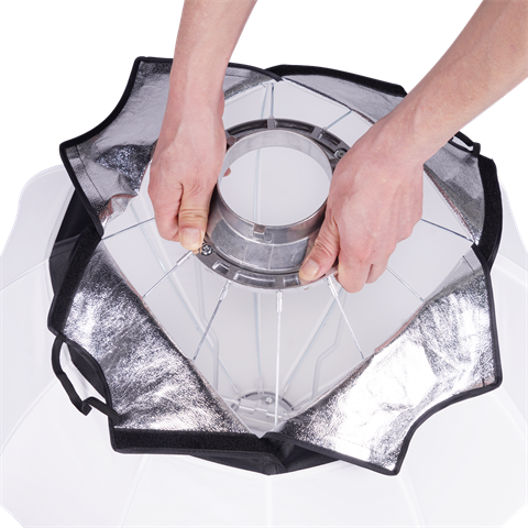 Je hebt de softbox gebruikt om licht zachter te maken. Doordat de softbox een ballonvorm heeft, zorgt het voor een brede spreiding. Speciale diffuus-materialen zorgen ervoor dat er licht over de gehele oppervlakte van de softbox komt. Zonder hotspots dus. De diameter van de softbox is 62cm. Daarbij is de diepte 55 cm. De adapterring is verwisselbaar en heeft een diameter van 129mm.
