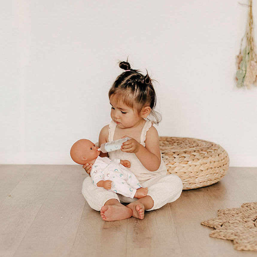 Met het magische drinkflesje van Smoby Baby Nurse heeft je babypop altijd genoeg melk. Als je het kunststofflesje rechthoudt, lijkt het net echt melk in te zitten. Hou je hem onderboven dan lijkt het flesje net echt leeg te lopen. Afmeting flesje: 12,5 x 3,5 x 3,5 centimeter