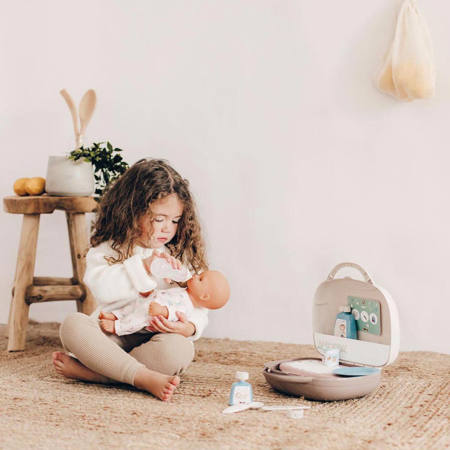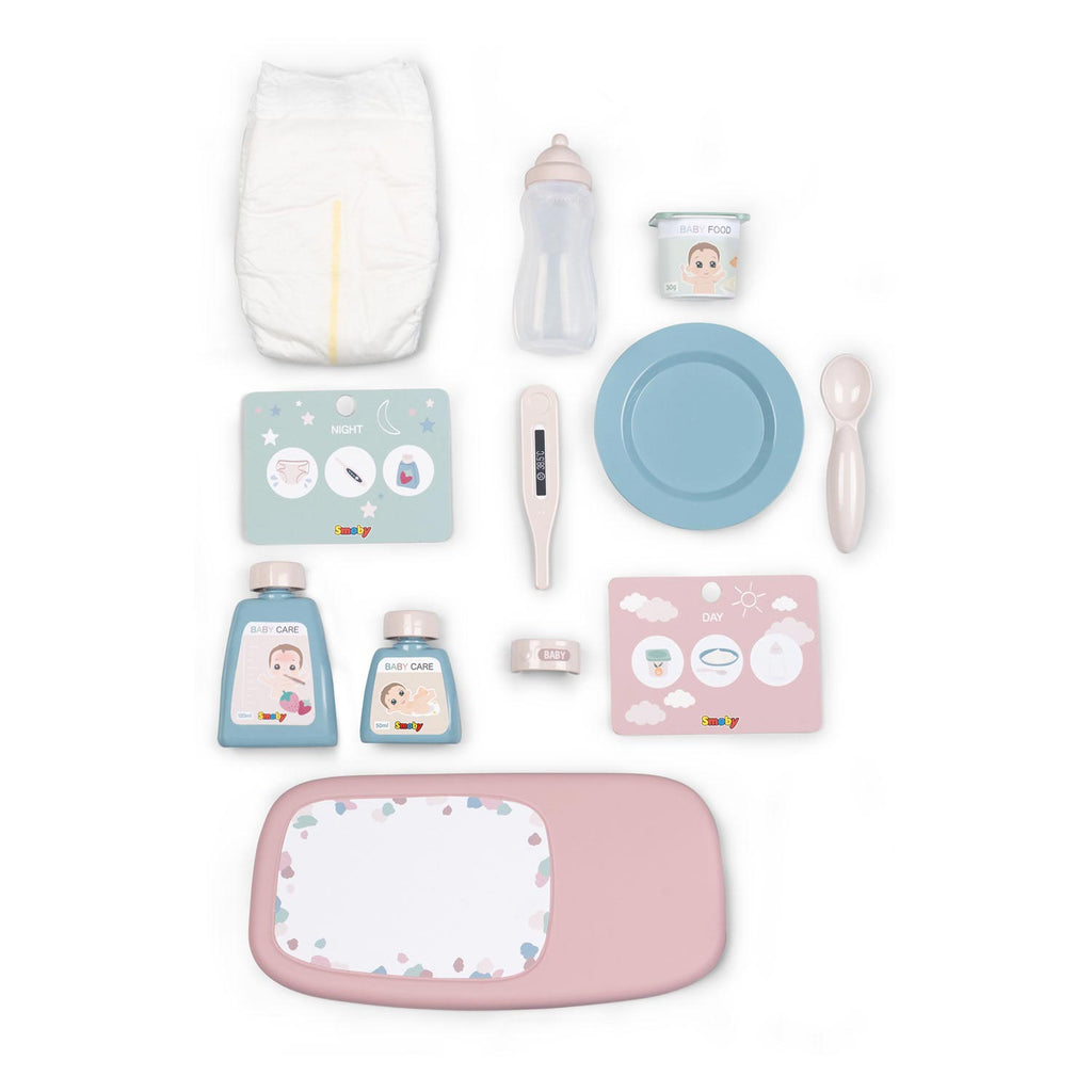 Smoby verzorgingsset voor poppen, 13-delig. Bestaande uit: kaarten, lepel, bordje, babyflesje, luier, thermometer, 2 flesjes, yoghurtkuipje, armband en een afneembaar plateau in de koffer, wat ook te gebruiken is als verschoontafel. Het koffertje is 24 bij 10,7 bij 24 centimeter groot. Geschikt voor kinderen vanaf 3 jaar oud.
